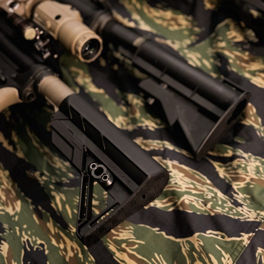 Druga kolba w ofercie producenta to Bantham. Tak jak CCS, cechuje się specjalnym, „opływowym” zatrzaskiem. Różnica tkwi w kształcie kolby oraz jej wyposażeniu. Wewnątrz niej znajduje się element stale wywierający napór na prowadnicę, dzięki czemu minimalizowane są irytujące luzy. Na kolbie rozmieszczono otwory w standardzie M-LOK, w których zamontować można punkty QD . Alternatywnie służyć mogą do przewleczenia pasa.