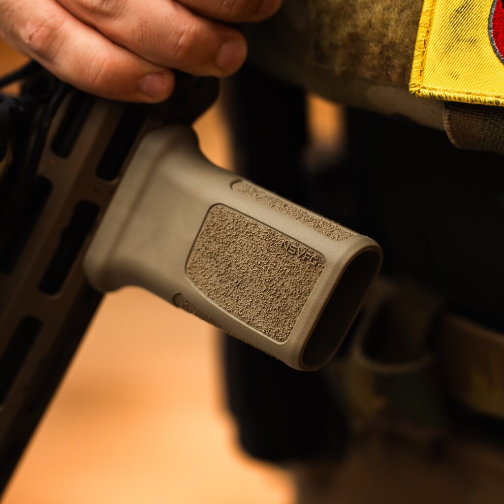 Not So Vertical Foregrip (NSVFG) to krótki, lekko pochylony (5°) chwyt przedni z mocowaniem M-LOK. Dostępny jest w wersji Flat oraz Angled – ta druga cechuję się wyprowadzonymi u góry ściankami i przeznaczona jest do łóż ze spodami o szerokości mniejszej niż 19 mm.