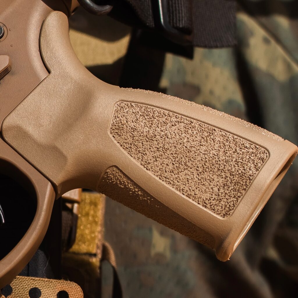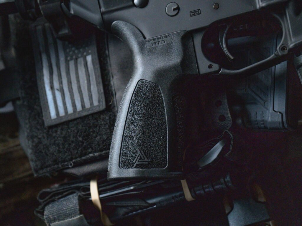 RTG (Rugged Tactical Grip) to chwyt standardu AR-15 cechujący się zredukowanym pochyleniem (19° vs 25° w A2) oraz usprawnieniami ergonomicznymi. Grubsza część chwytna, cechująca się agresywną fakturą, łagodnie zwęża się w kierunku „ostrogi” (beavertail), tworząc ergonomiczny kształt.