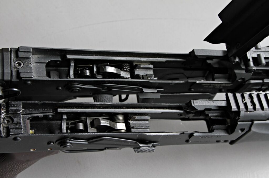Po drugie: szczęki magazynków zbudowane są w taki sposób, że podpinając go do gniazda, trzeba pokonać opór jego sprężyny – pierwsza sztuka amunicji wystaje z magazynka bardzo mocno i wpinając magazynek do gniazda, trzeba amunicję znajdującą się w nim mocno ugnieść. To, w połączeniu z faktem, że magazynek podpina się tak jak w AK (tj. ząb z przodu i zatrzask z tyłu), nie sprzyja ani szybkości, ani precyzji. Problem znika dopiero, jeśli wymienia się magazynek z zamkiem broni zablokowanym w tylnym położeniu. Odpada więc taktyczne doładowanie na zamkniętym zamku, z nabojem w komorze, a to w znacznym stopniu utrudnia taktykę na torze.