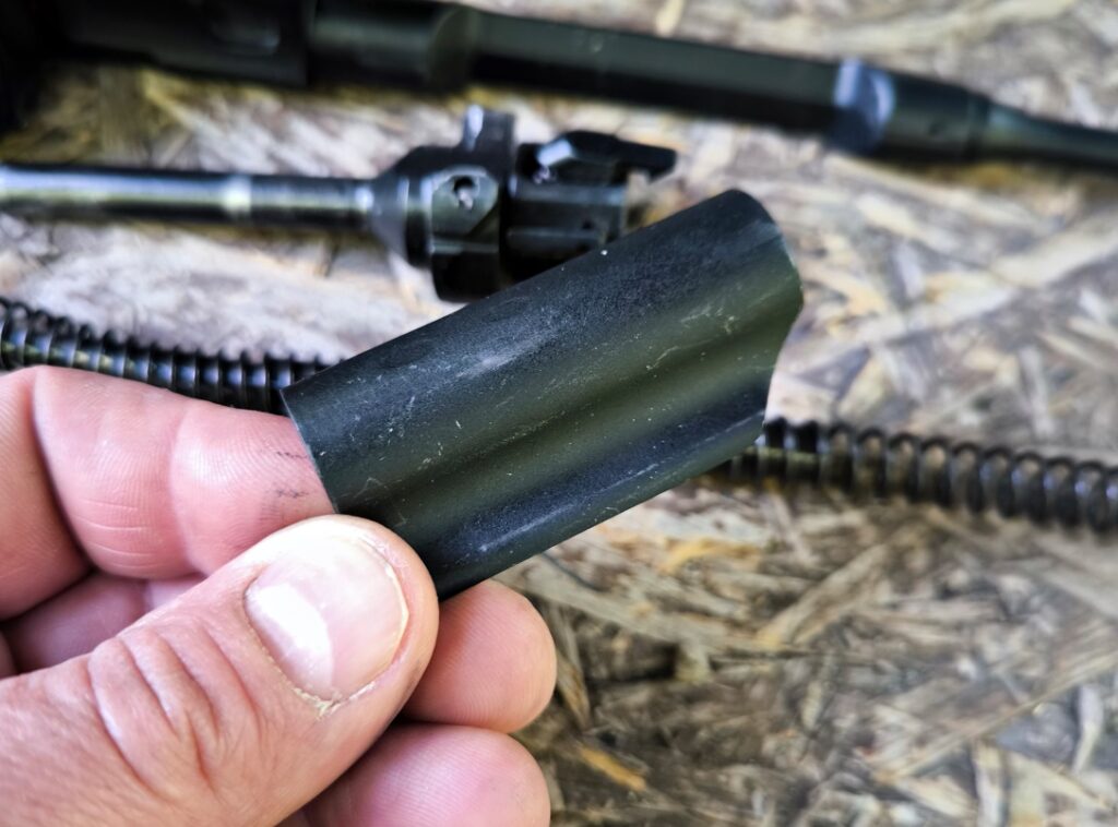 Przy lżejszej amunicji sportowej miałem delikatne problemy na samym początku mojej znajomości z ArmTaciem, ale po przeprowadzeniu dogłębnego rozeznania i naukowej analizy (czytaj: spędzeniu wieczoru z domową nalewką i YouTube) odkryłem, że przyczyną problemów jest znajdująca się na żerdzi sprężyny blaszka mająca zabezpieczać wnętrze komory zamkowej przed zanieczyszczeniami. Po usunięciu tego elementu problemy ustały: Armtac działa poprawnie na każdej amunicji o naważce śrutu równej lub przekraczającej 28 g.