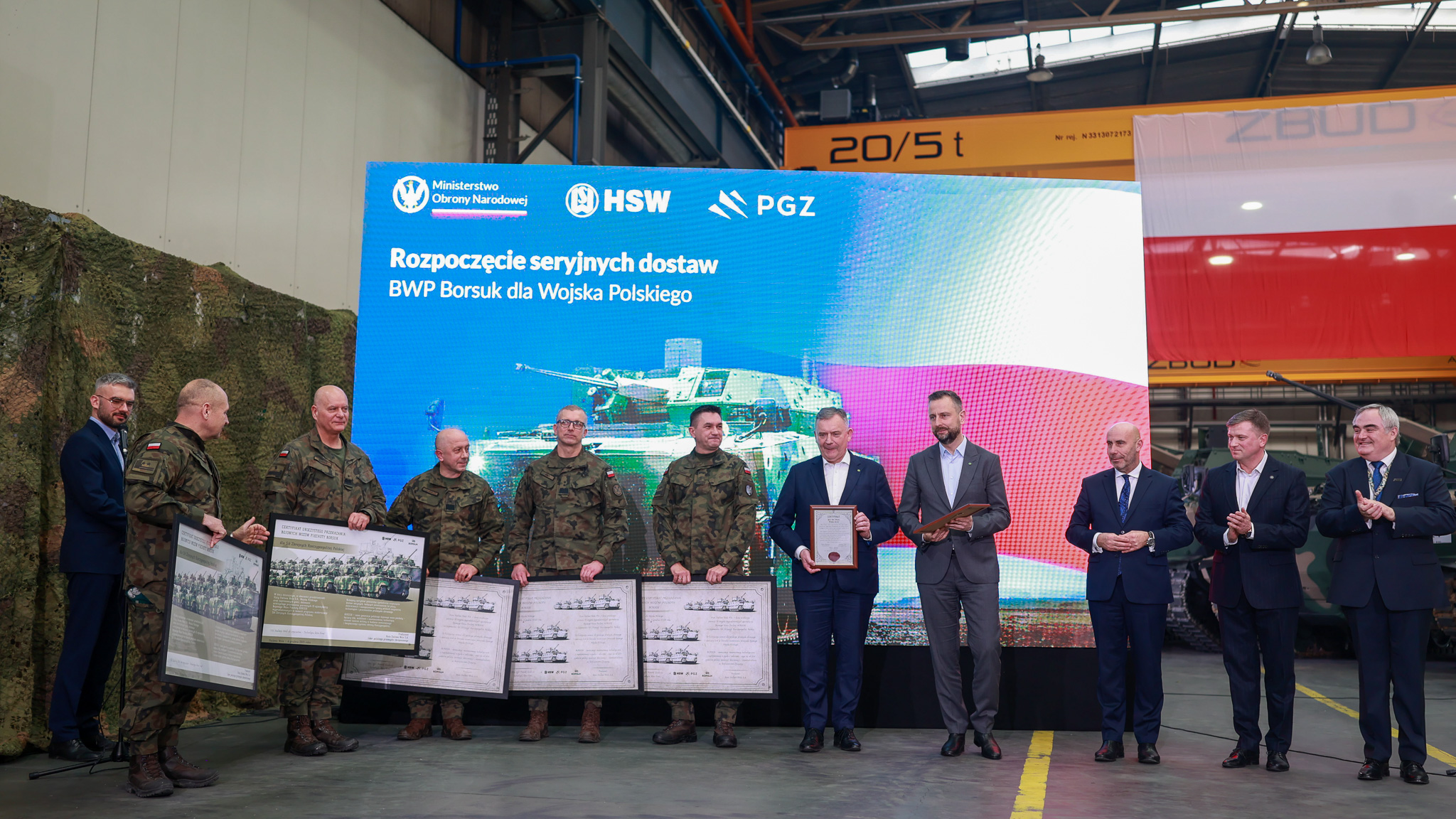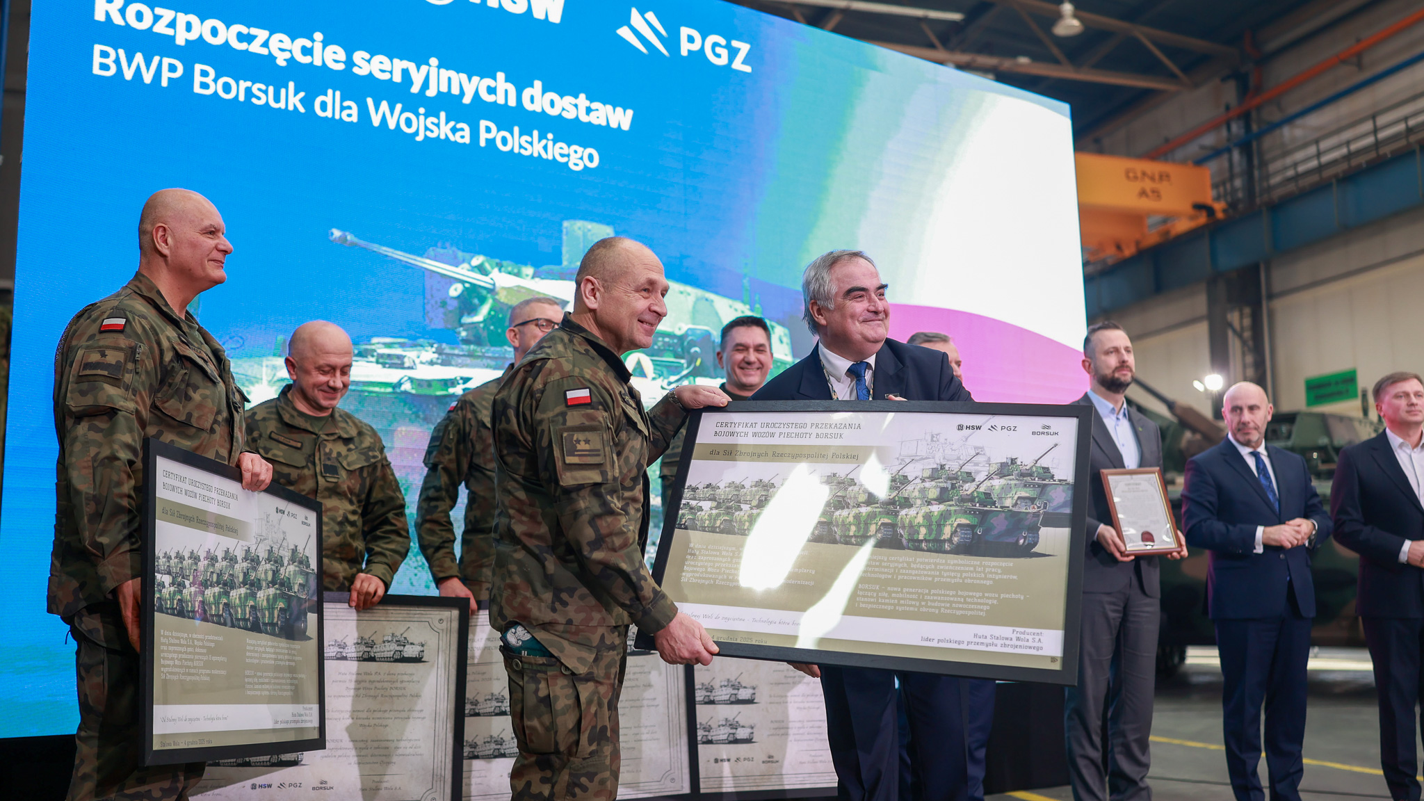W czwartek, 4 grudnia 2025, w Stalowej Woli, wicepremier i minister obrony narodowej Władysław Kosiniak-Kamysz, wiceminister obrony narodowej Paweł Bejda i szef Agencji Uzbrojenia gen. dyw. Artur Kuptel uczestniczyli w uroczystości przekazania w Hucie Stalowa Wola przez Polską Grupę Zbrojeniową Siłom Zbrojnym RP pierwszych 15 seryjnych egzemplarzy bojowych wozów piechoty Borsuk.