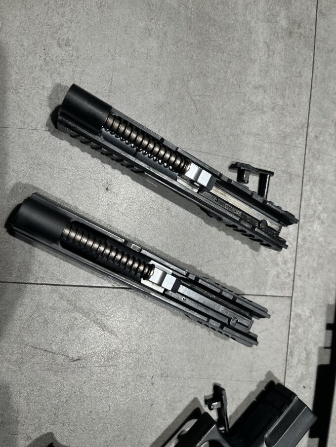 Oba modele wyposażono w szynę akcesoryjną do montażu latarek czy wskaźników laserowych. W obecnych czasach to absolutny wymóg. Nowsza wersja ma tę szynę wyprowadzoną na większej długości, co na pewno przełoży się na kompatybilność z akcesoriami. W nowej wersji numer seryjny umieszczono na metalowej kształtce zamontowanej w szkielecie, którą widać w wycięciu szyny montażowej. Stara wersja ma numer na płytce przymocowanej z boku szkieletu.