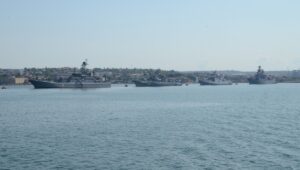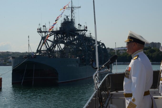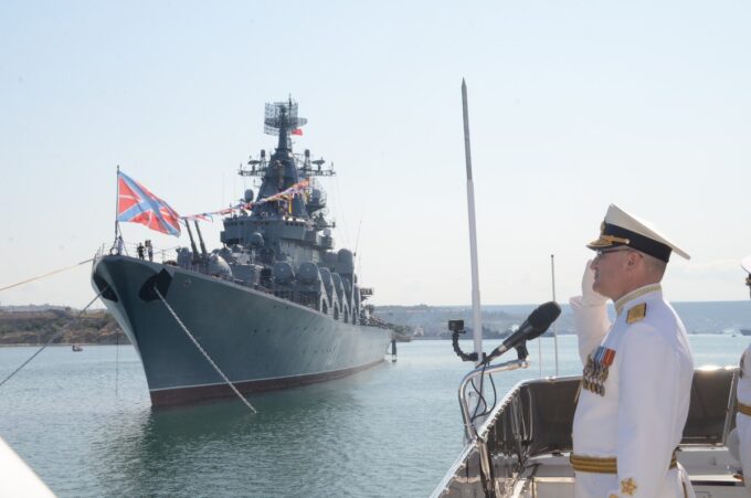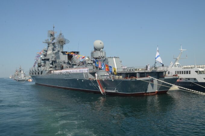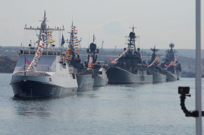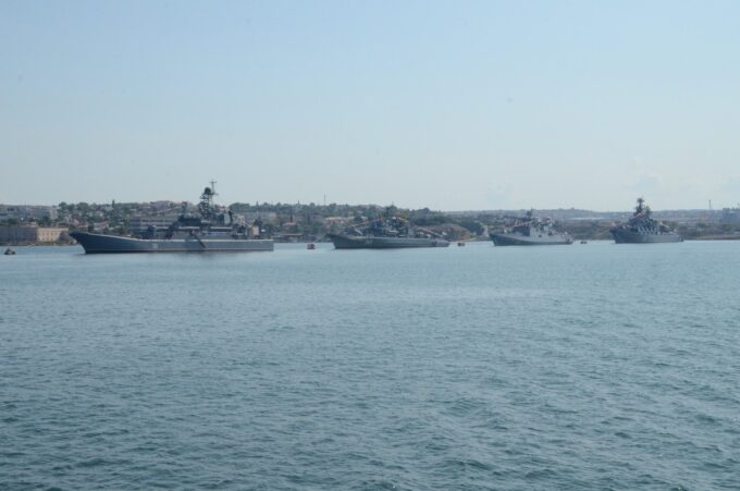 W porcie w Sewastopolu, na okupowanym przez Rosję ukraińskim Krymie, w dwóch rzędach defilowały m.in. trałowiec RFS Iwan Antonow (601) projektu 12700 Aleksandrit, mały okręt rakietowy Oriechowo-Zujewo (626) projektu 21631 Bujan-M, okręt desantowy Azow (151) projektu 775, okręty patrolowe PS FSB Pytliwy i Ametyst, fregata rakietowa Admirał Essen (751) projektu 11356Р/М, krążownik rakietowy Moskwa projektu 1164 Atłant, okręt ratowniczy Kommuna (najstarszy operacyjny okręt na świecie – w służbie od 1915 roku) oraz konwencjonalny myśliwski okręt podwodny B-268 Nowogród Wielki projektu 636.3 Warszawianka. U wyjścia z Zatoki Sewastopolskiej towarzyszyły im potem: kutry patrolowe (przeciwdywersyjne) projektu 03160 Raptor, poduszkowiec desantowy Samum (616) projektu 1239 Siwucz, mały okręt rakietowy Grajworon (600) projektu 21631 Bujan-M, okręty desantowe Cezar Kunikow i Nowoczerkask projektu 775 oraz fregata rakietowa Admirał Grigorowicz (745) projektu 11356Р/М. Ponadto, w powietrzu znalazły się śmigłowce Ka-27, Mi-8AMTSz, Mi-28N i Ka-52, samoloty bojowe Su-30SM, Su-34, Su-27 , Su-27, SU-25SM, samoloty patrolowe Be-12 i An-26 ze składu lotnictwa WMF, Sił-Powietrzno-Kosmicznych (WKS) oraz Południowego Okręgu Wojskowego.