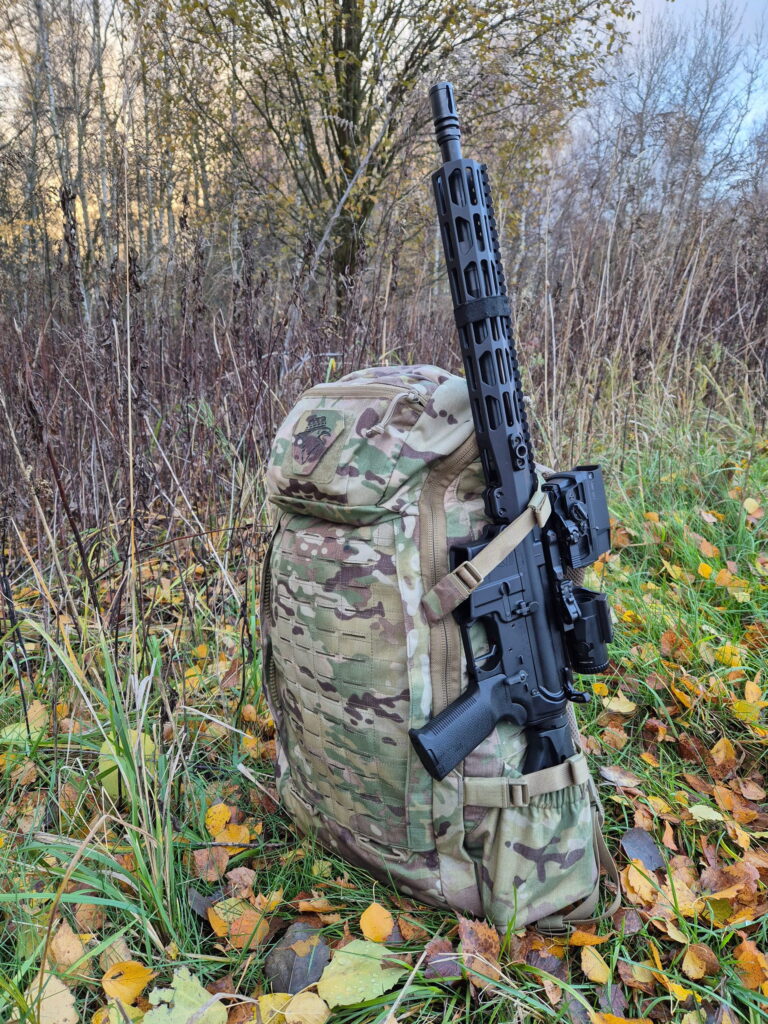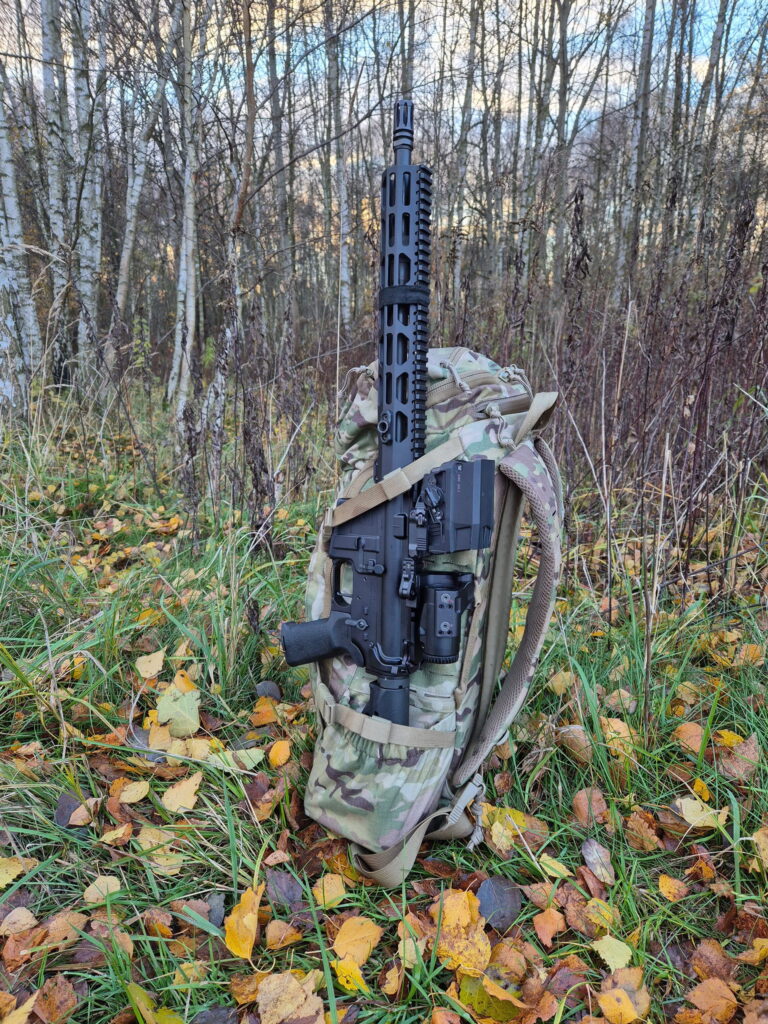 Jako że zawody tego typu pozwalają na przenoszenie broni poza przestrzenią roboczą rąk, zastosowałem sprytny sposób, znany z niektórych plecaków myśliwskich. Karabin na Halifax może być z powodzeniem zamontowany wzdłuż bocznej ścianki, blokując kolbę wewnątrz kieszeni na wodę. Paski kompresyjne blokują łoże tuż pod górną krawędzią plecaka, co daje nam bardzo stabilny i wygodny sposób mocowania. Jedynym problemem jest rozłożenie wagi, to jednak możemy naprawić przekładając zapasy wody na przeciwną stronę. Istotnym szczegółem jest to, że karabin którego używałem podczas LP, wyposażony jest w Magpul STR, czyli grubą i wygodną kolbę. Mniejsze modele jeszcze łatwiej wejdą w kieszeń. Z dziennikarskiego obowiązku, muszę wam zaznaczyć, że nie jest to patent który oficjalnie jest opisany przez Direct Action, więc traktujcie to jako dodatkowy ficzer plecaka.
