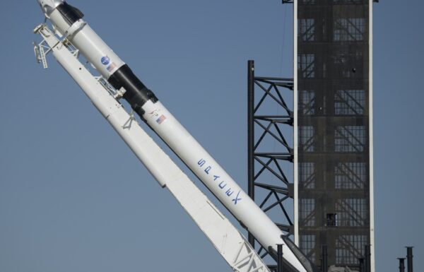 A SpaceX Falcon 9 rocket with is raised into a vertical position on May 21, 2020.