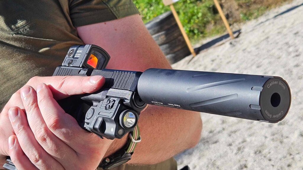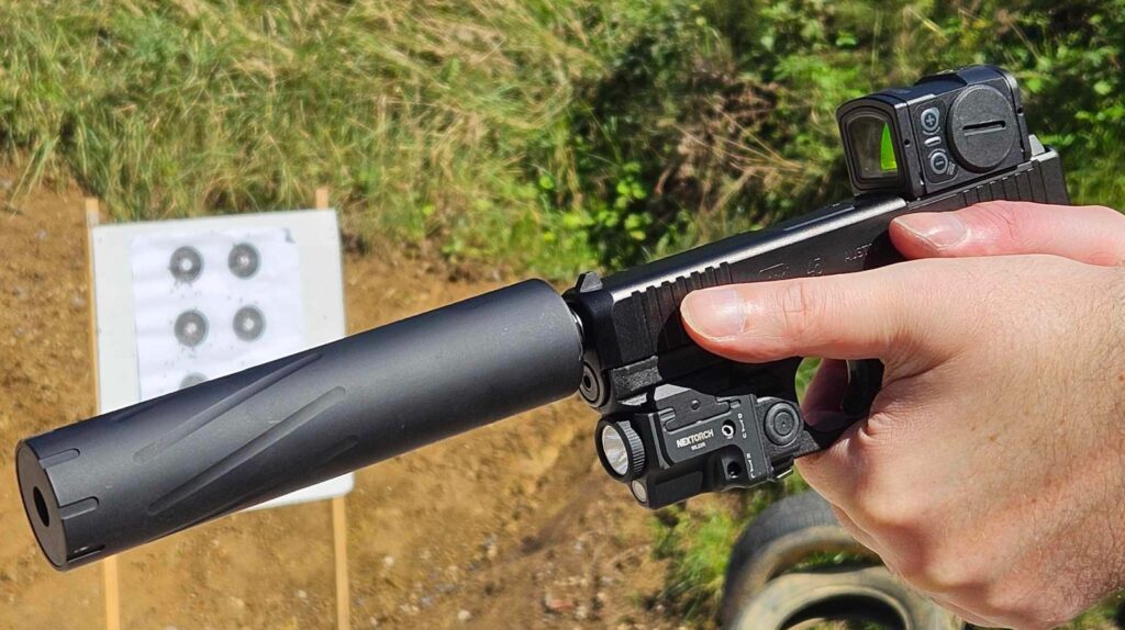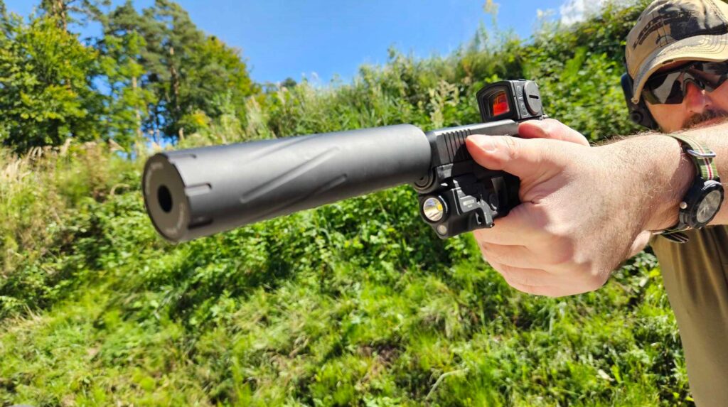 The new suppressor Pistol S, is a shorter version of the Pistol model of Hush-Tac, a proprietary brand of suppressors created by Łuszczek company (pronounced like ‘wushchek’). The length has been reduced from 190 mm to 155 mm. As a result, the weight has decreased from 250 g to 205 g. The diameter remains unchanged at 35 mm. Due to the smaller chamber, the noise reduction has decreased from 35 dB to 30 dB.