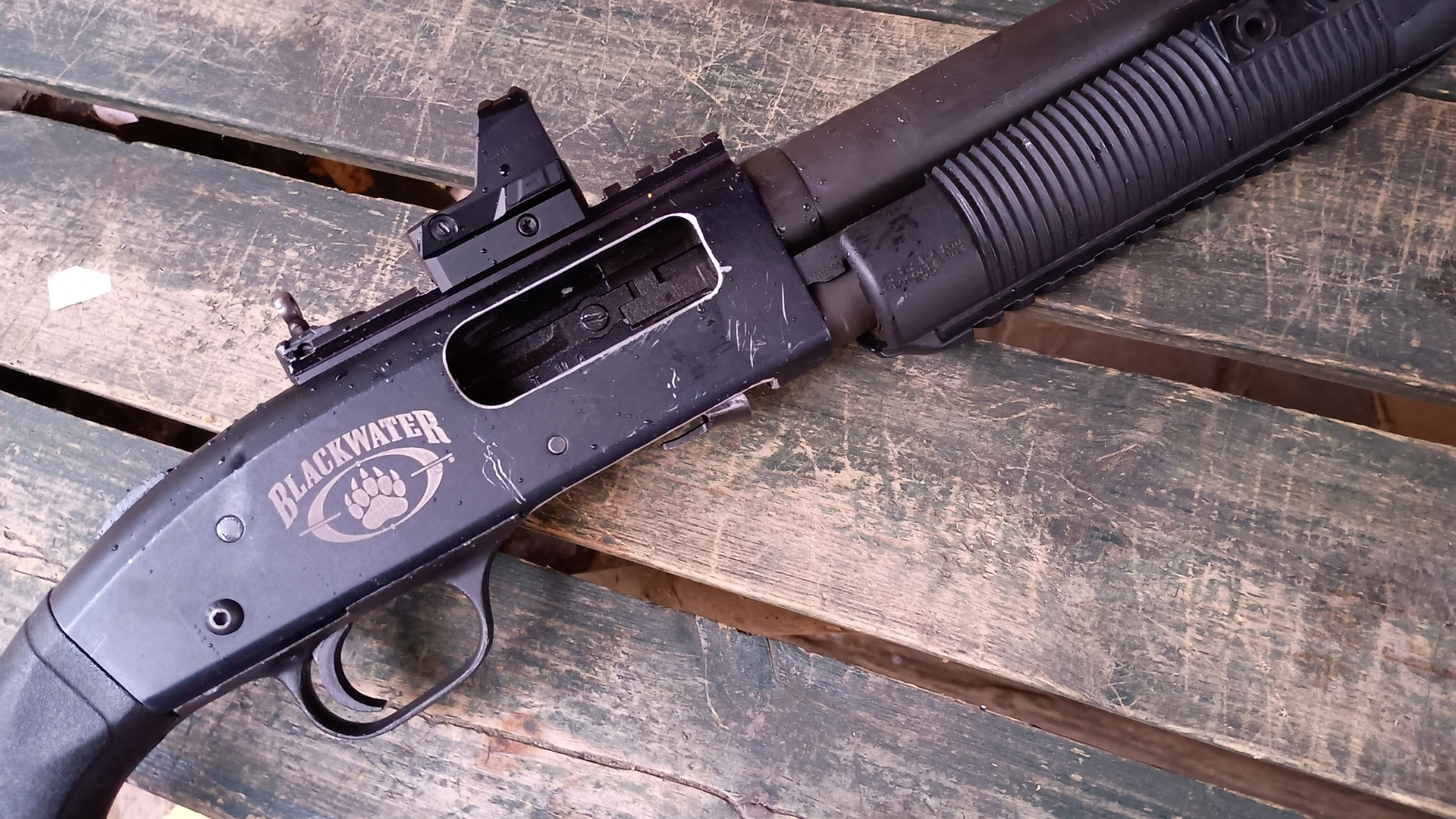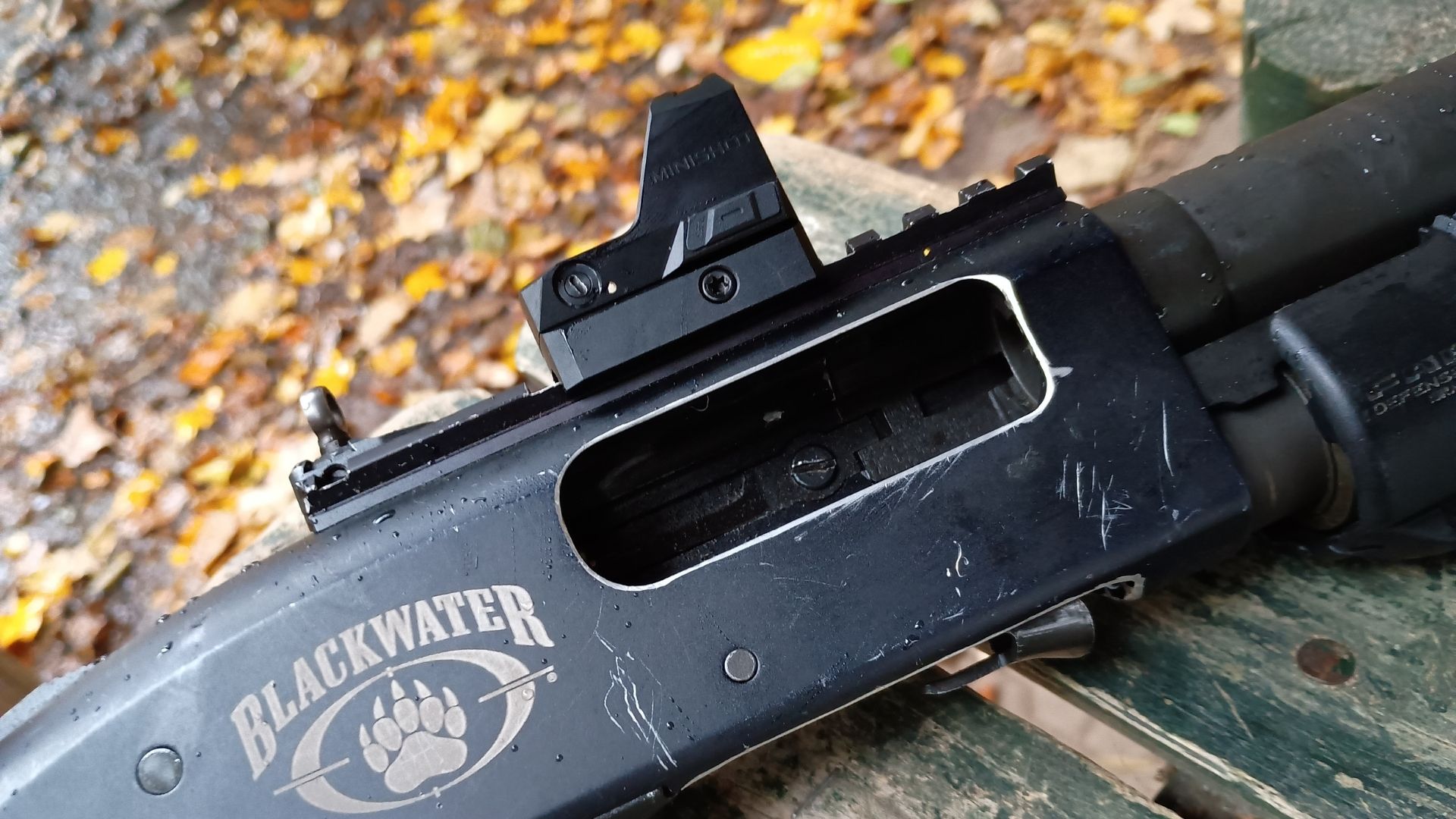 I’m not a fan of semi-auto shotguns, so I run all my tests on a pump – a Mossberg M590A1. The variant I use is equipped with iron sights, but the little SightMark works just fine – meaning the irons don’t get in the way, but because of the sight’s relatively high mount they stop being functional. There’s no so-called co-witness.