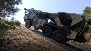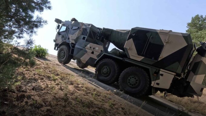The Tatra T815-7 6×6 chassis, known for its high off-road mobility, is equipped with an armored cabin at the front, protecting the crew from small arms fire up to 7.62 mm caliber and artillery shell fragments. The main armament is mounted at the rear in a specialized turret, which features an electro-optical observation system equipped with a television camera, thermal imaging camera, and laser rangefinder. The power units in the turret and chassis are driven by the vehicle’s engine, supplying both the electrical and hydraulic systems.