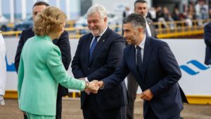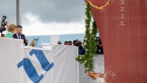 The ship’s sponsor was Queen Sofía (known in Poland as Zofia of Greece), wife of King Juan Carlos I, who reigned from 1975 to 2014 until his abdication. The event was attended by Spanish Prime Minister Pedro Sánchez, President of the Xunta de Galicia Alfonso Rueda, the Government Delegate in Galicia Pedro Blanco, and the Mayor of Ferrol José Manuel Rey, as well as representatives of the armed forces, including Chief of the Defense Staff (JEMAD) Adm. Teodoro López Calderón, and key figures from the shipbuilding industry, including Navantia’s president, Ricardo Domínguez.