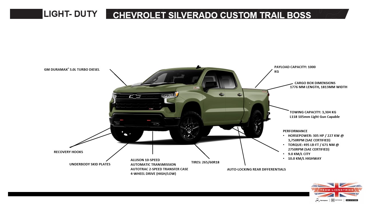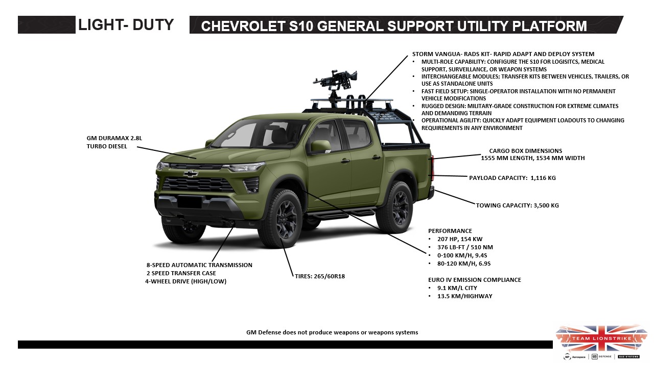 - GSUP – based on the Chevrolet S10 Work Truck, delivering capacity for 4 crew, flexible and modular cab/utility configurations, 207HP diesel, and a payload of 1116 kg.