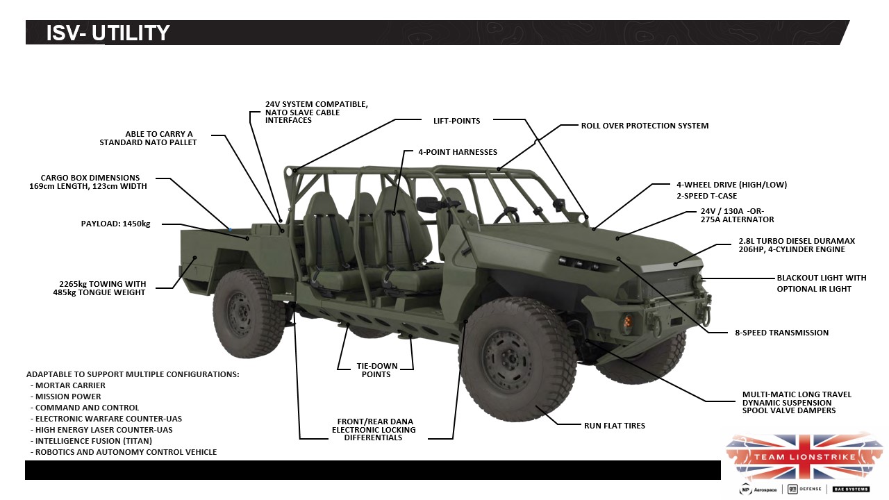- Infantry Squad Vehicle-Utility (ISV-U) – based on the Chevrolet Colorado ZR2 platform, delivering capacity for up to 5 crew, open-top utility and tactical configurations.