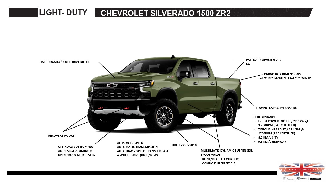 - Silverado 1500 ZR2 – a light duty, more powerful variant delivering capacity for 5 crew, flexible and modular cab/utility configurations, 305HP diesel, and payload of 705kg.