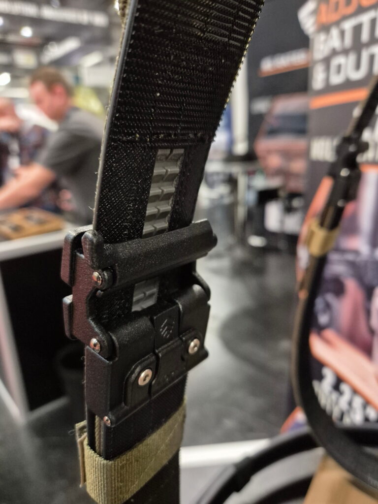 Obok zobaczyć mogliśmy również pas z naszytymi taśmami, a więc nieco bardziej staroszkolne, ale nadal lubiane podejście do pasa zewnętrznego. Mimo przeznaczenia pasy maiły opatentowany przez KORE system regulacji, bazujący na kompozytowej listwie regulującej po wewnętrznej stronie paska, którą znamy z serii X.