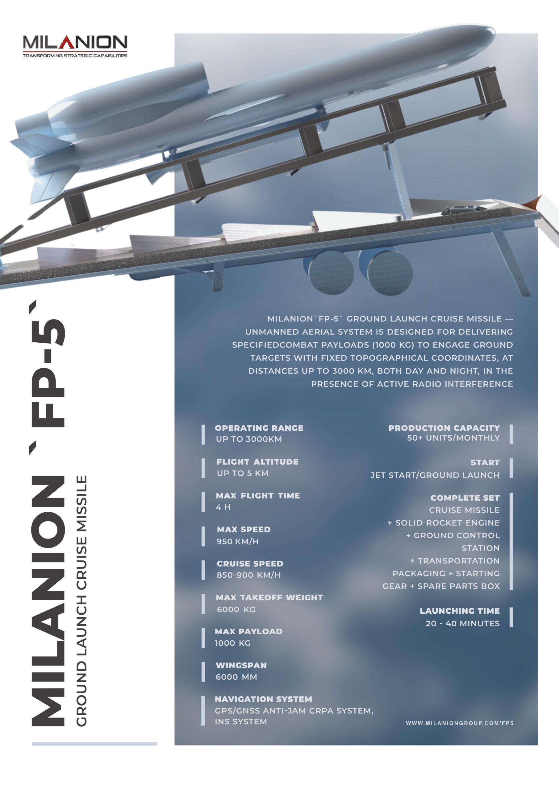 W niedzielę, 17 sierpnia 2025, ukraiński dziennikarz Jefrem Łukacki, współpracujący z Assiociated Press, opublikował na swoim profilu na Facebooku fotografię nowego ukraińskiego pocisku manewrującego Flamingo o deklarowanym zasięgu ponad 3000 km. Wydaje się, że jest to projekt spółki Milanion Group Ltd o oznaczeniu zakładowym FP-5.