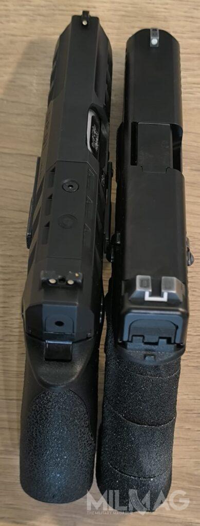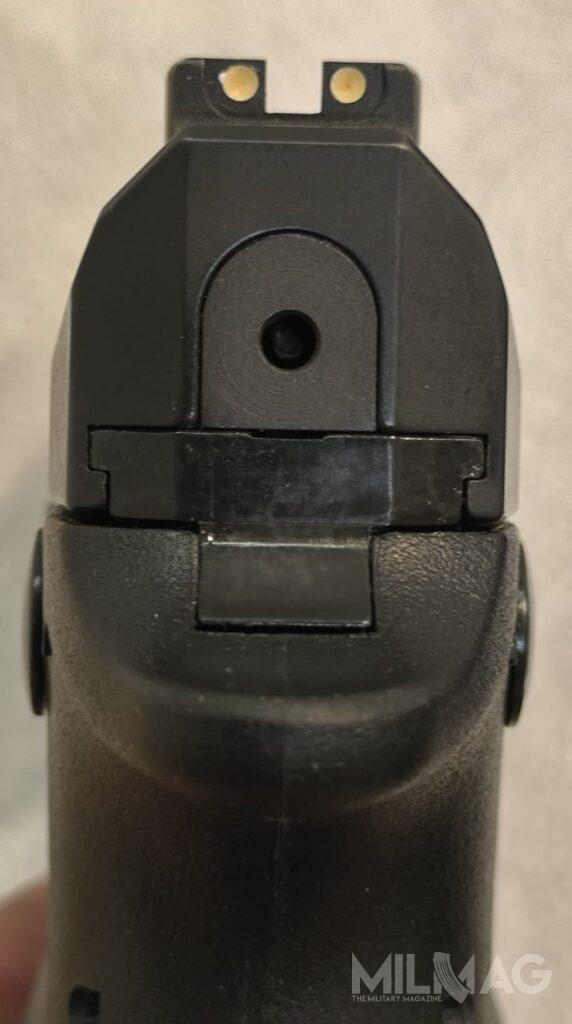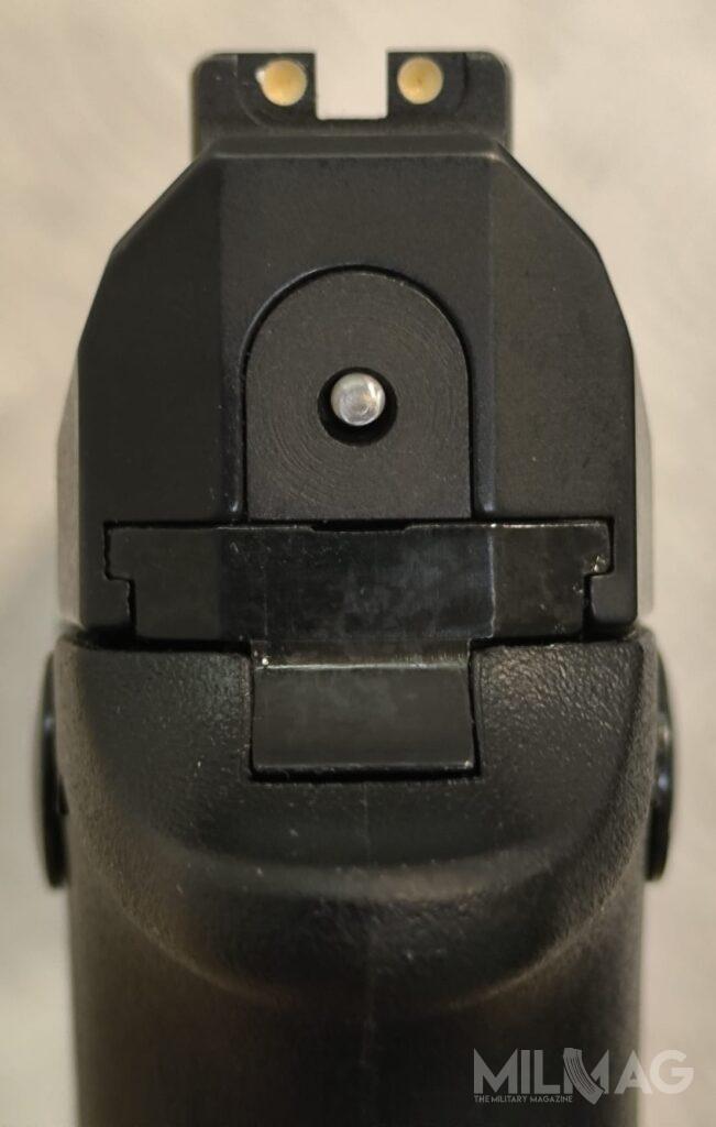 Jak się patrzy z tyłu na zamki obu pistoletów, to mamy nieco inny widok, chociaż przyrządy celownicze, szczerbinki, są takie same, dwie kropki, to już w P1 widać kurek, a po odciągnięciu tylną cześć iglicy.