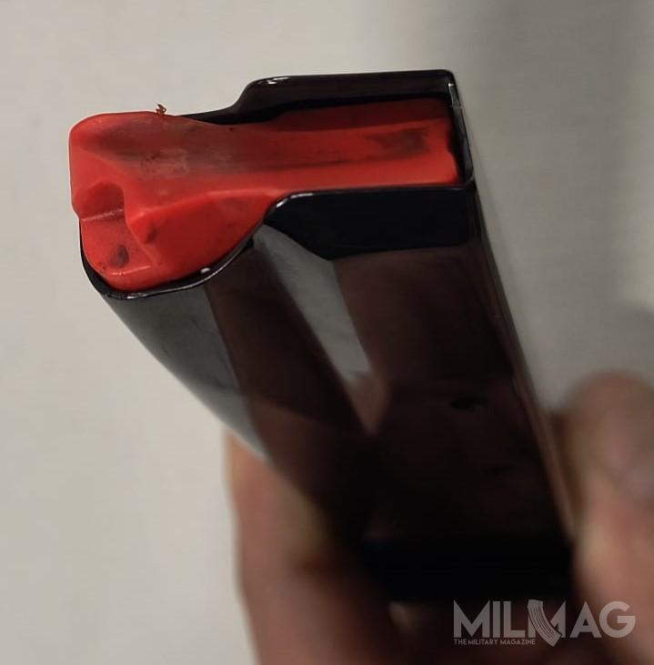 Jeśli chodzi o magazynki, to wykonane są z metalu i w wysokiej jakości, tak jak reszta broni. W zestawie mamy dwie sztuki. Dosyłacze są w kolorze mocno oczo… rzucającym się w oczy, więc ciężko o pomyłkę i nie trzeba się zastanawiać, czy jest w nich jeszcze ammo 🙂 Oczywiście można je rozebrać, na wypadek wpadnięcia w błoto czy inny brud. Posiadają otwory inspekcyjne, ale nikt nie uznał za stosowne dodania cyferek i liczb określających ilość amunicji we środku. W sumie mieści się maksymalnie 15 sztuk, otwory są 3, matematykę zostawiam Wam.