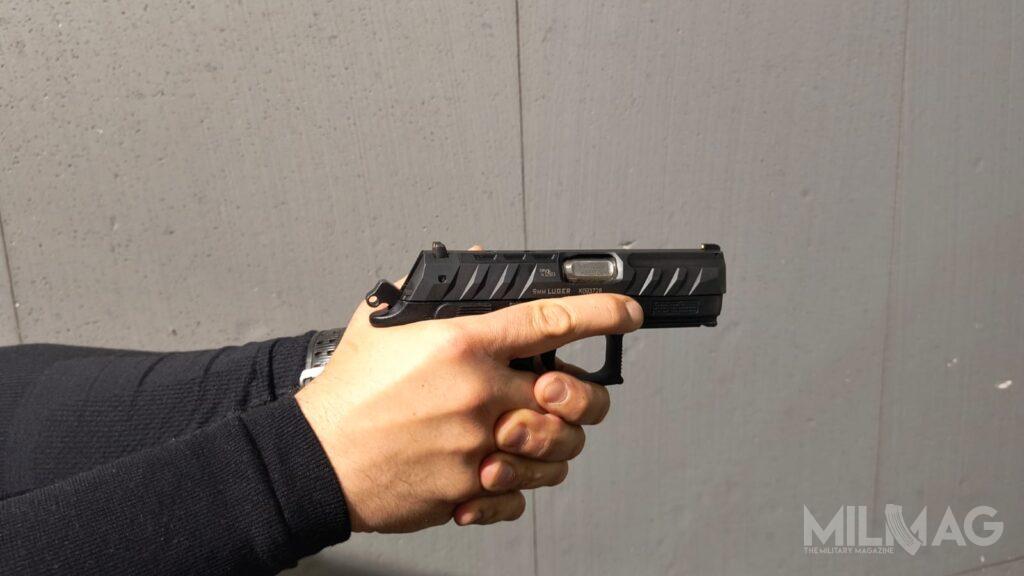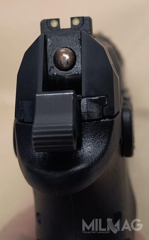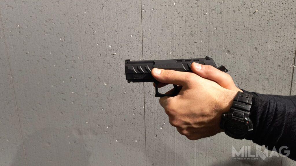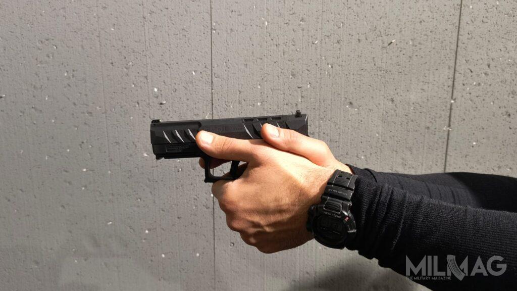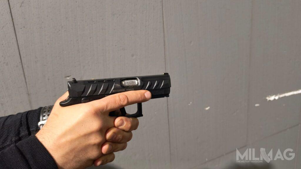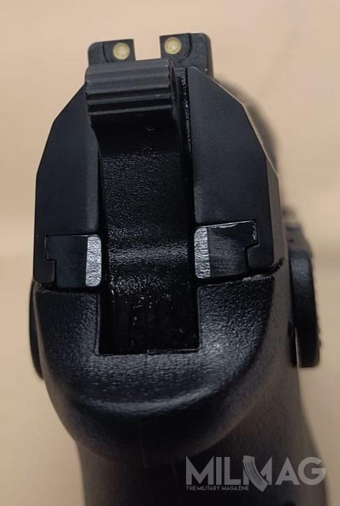 Wykończenie powierzchni broni jest na bardzo dobrym poziomie. Głębokie nacięcia na zamku gwarantują pewny chwyt i manipulowanie bronią. Czy to przeładowanie, czy press check, wszystko idzie bardzo miło i bez problemów. Broń wyposażono także w standardową szynę akcesoryjną na okoliczność podczepienia latarki bądź celownika laserowego.