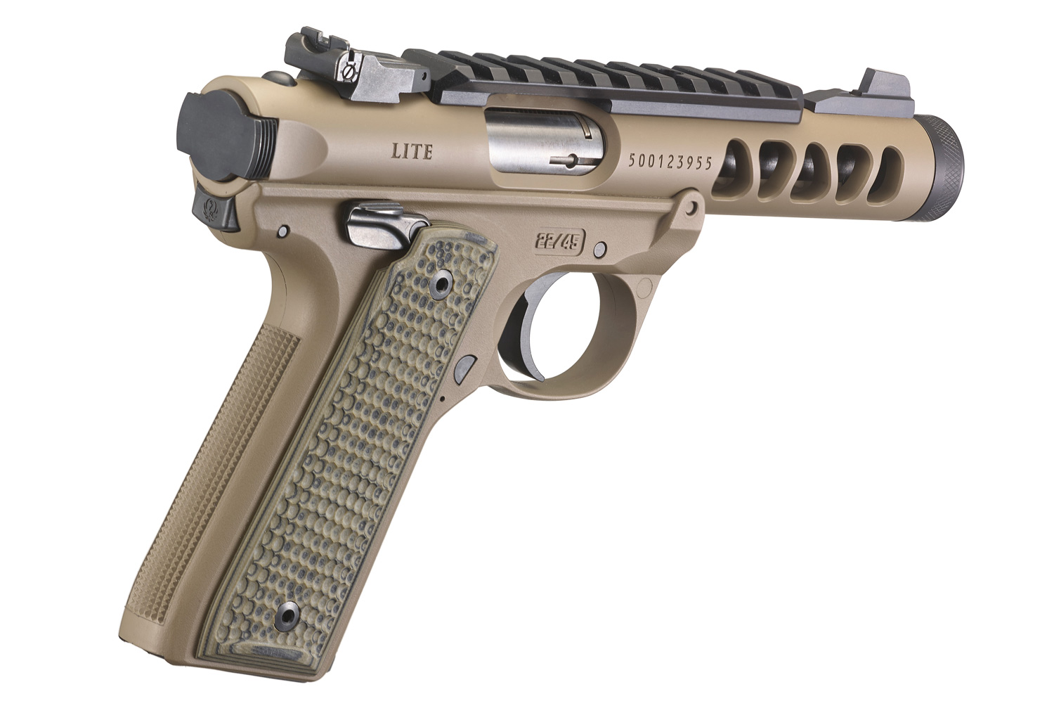 W dostawie znajdzie się bliźniaczo podobny model, ale jednak o całkowicie odmiennej stylistyce. Ten Mark IV 22/45 LITE (43920) wykończony został w matowym, piaskowym kolorze (Flat Dark Eart, Cerakote) oraz wyposażony w dwukolorowe okładki z laminatu G10, przypominające swoją fakturą skórę pustynnego gada. Połączenie przywodzące na myśl spieczoną słońcem Arizonę.