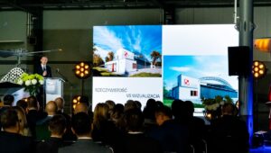 Uczestnicy uroczystości mieli także okazję obejrzeć ciekawą prezentację przedstawicieli generalnego wykonawcy – firmy Łęgprzem, prezentującą etapy realizacji inwestycji z budowlanego punku widzenia.