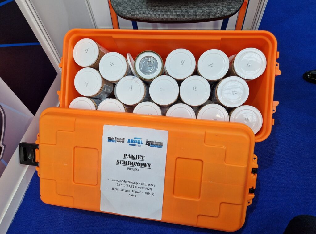 Na stoisku zaprezentowano również projekt pakietu schronowego. W jego skład wchodzi polimerowa skrzynia, w której mieści się kilkadziesiąt dań gotowych w samopodgrzewających się puszkach. Po otworzeniu i wymieszaniu dania, należy przebić do pełnej głębokości 6 otworów widocznych w pierścieniu pomiędzy puszką zewnętrzną a puszką, w której znajduje się danie. Po przebiciu należy przykryć całość plastikowym wieczkiem i grzać 8-12 min, od czasu do czasu mieszając danie.