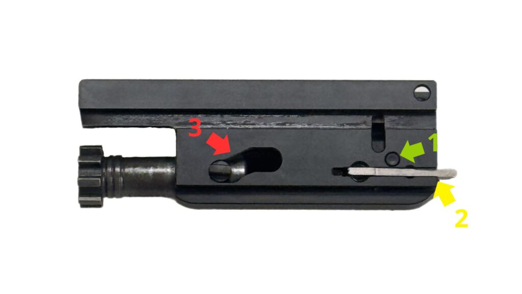 1 – kołek iglicy, 2 – dźwignia, 3 – kanał wodzika zamka