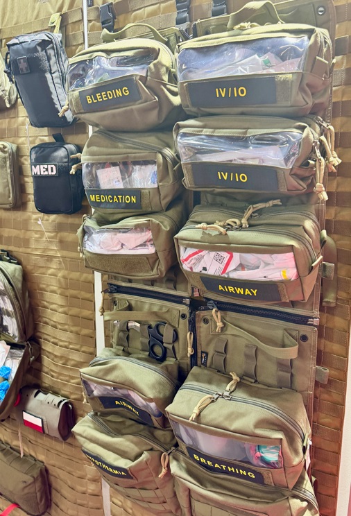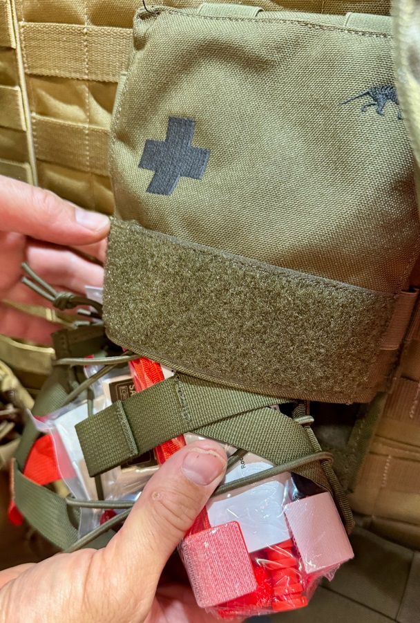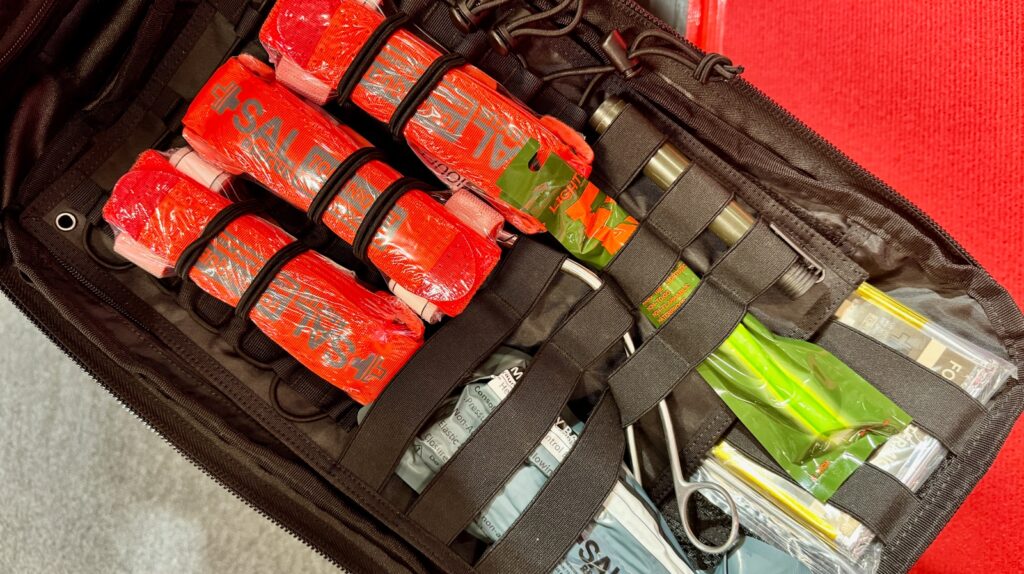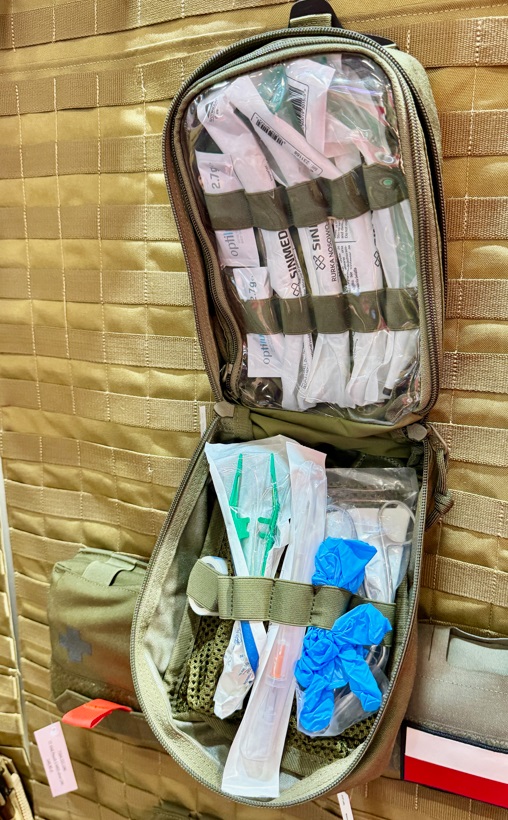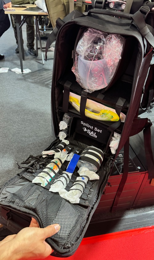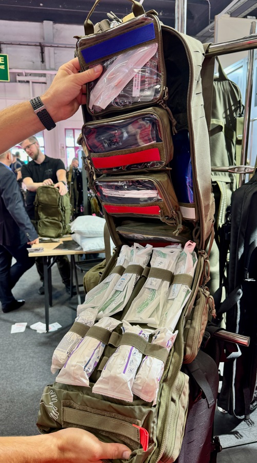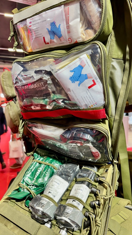 Druga, bardzo duża i różnorodna strefa, to wyposażenie związane z pierwszą pomocą i ratownictwem. Mogliśmy tu obejrzeć duże i bogato wyposażone plecaki i torby medyczne, apteczki IFAK, ale także na przykład małe i dyskretne apteczki osobiste dedykowane strzelcom sportowym, czy też ogromne zestawy organizerów na sprzęt i materiały opatrunkowe dedykowane do polowych punktów pomocy medycznej.