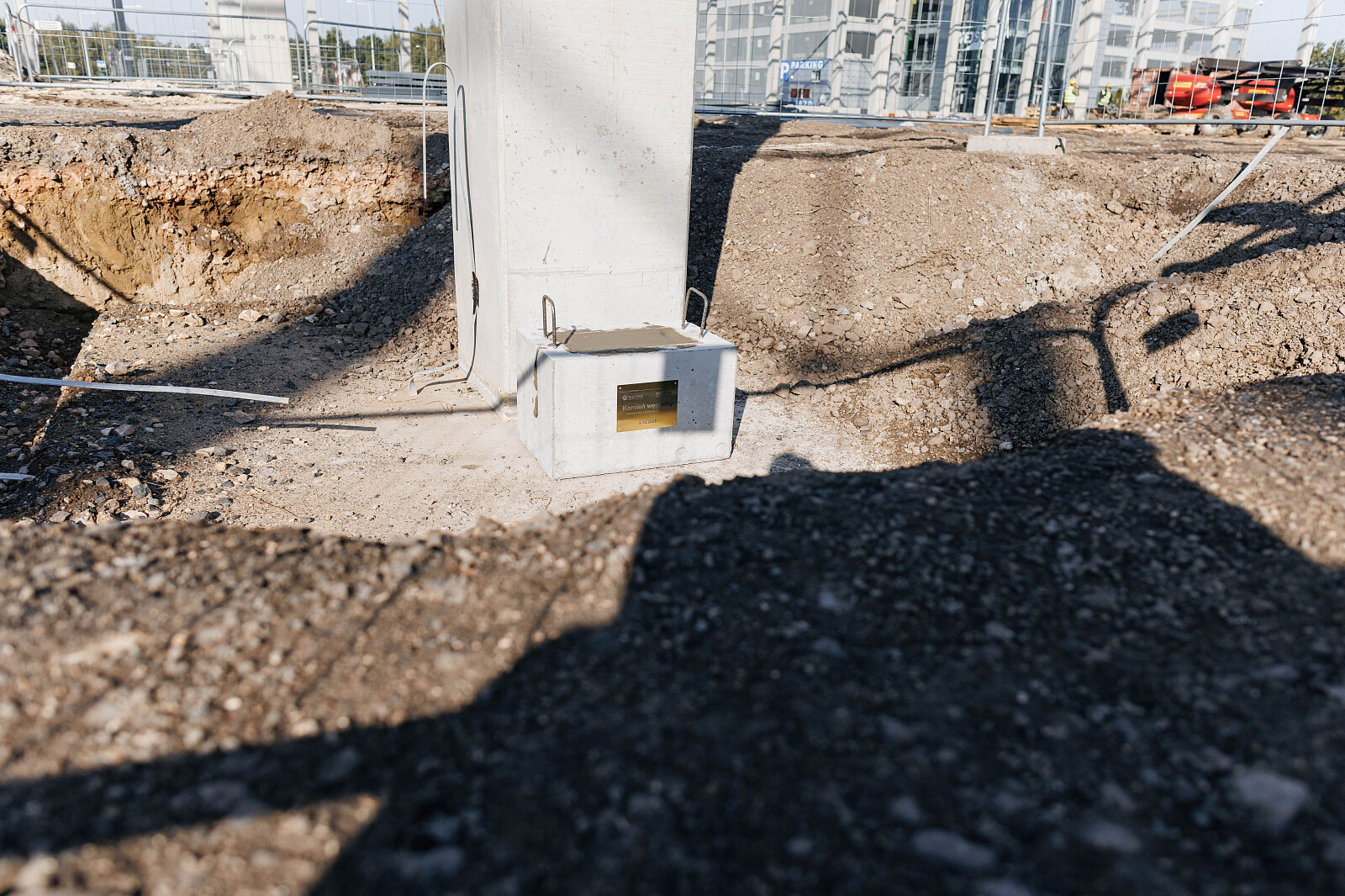 Kamień węgielny, ważący 180 kilogramów, trafił na budowę z pomocą ładowarki teleskopowej. Został położony na stopie fundamentowej.