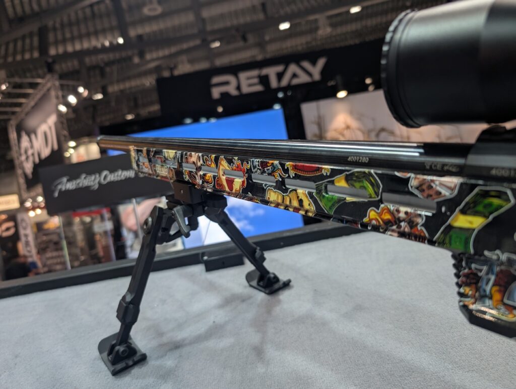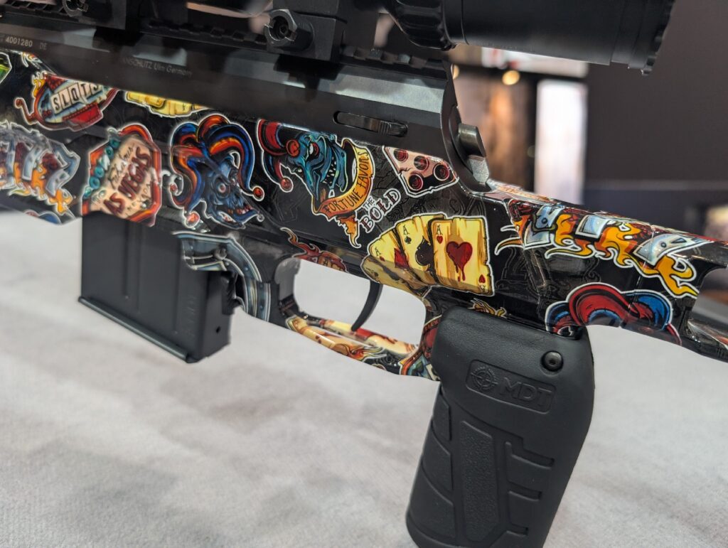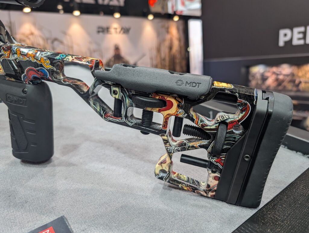 Drugim unikatem Anschütz w zestawieniu jest 1761 APR MDT ACC PREMIER XRS w wykończeniu „Creeper”. O ile w przypadku pierwszego karabinu mamy do czynienia z wykończeniem o bardziej cieplejszych barwach, tak „Creeper” nawiązuje do dark art. Motyw pełen jest czaszek oraz szkieletów, które przebijają dominujące odcienie szarości kontrastującymi, błękitnymi akcentami.