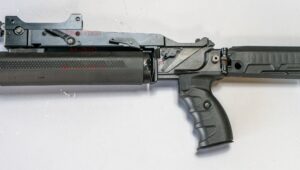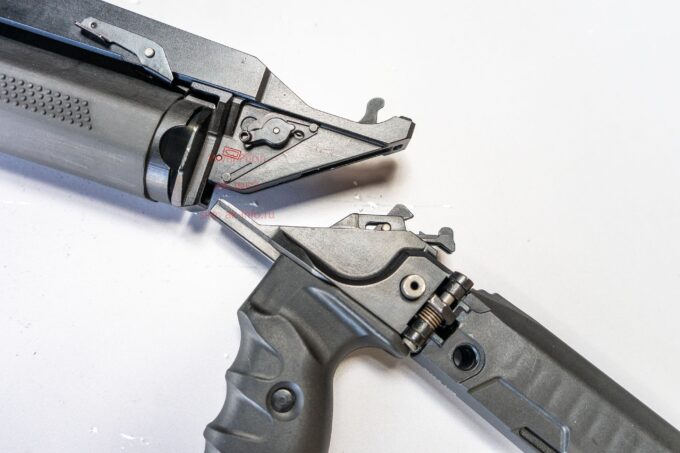 Manipulatory granatnika zdublowano na obie strony. Co ciekawe, lufa odchylana jest na lewo lub prawo, w zależności od wybranego zwalniacza (защелка ствола). Zaraz przez zwalniaczem umieszczono spust w postaci dźwigni (спуск), obsługiwanej najprawdopodobniej kciukiem. Bezpiecznik (предохранител) umieszczony jest natomiast z tylu.
