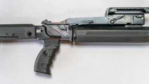 W module wykorzystano chwyt zapożyczony z AK-12 wzór 2017 oraz kolbę z AK-12 wzór 2020, w której zachowano możliwość składania. Na pierwszy rzut oka, moduł przypomina prosty wycinek komory zamkowej.