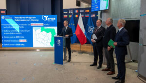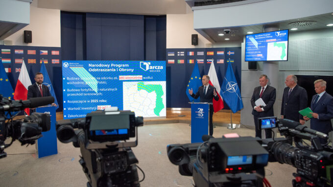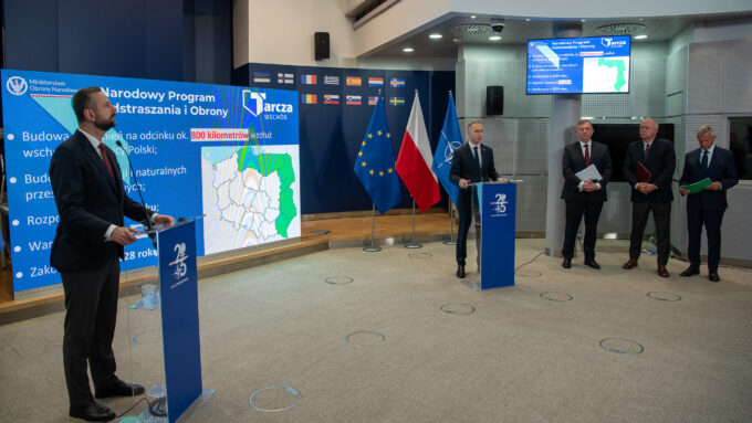 Narodowy Program Odstraszania i Obrony „Tarcza Wschód” to jedno z zadań, które postawił przed nami premier Donald Tusk, premier Władysław Kosiniak Kamysz, żeby granica wschodnia Rzeczypospolitej, granica północna Rzeczypospolitej Polskiej to były granice bezpieczne. Co zastaliśmy? Wszyscy wiemy, możemy zobaczyć to na szeregach filmów. Zastaliśmy dziurawy płot, który miał być jakąś zaporą przeciwko temu, co może nam grozić ze Wschodu, no ale okazał się dziurawy jak sito. Natomiast jednym z pierwszych zadań, które stanęły przed Radą Ministrów było opracowanie właśnie Tarczy Wschód. To jest program, który obejmie kluczowe województwa, czyli województwo pomorskie, warmińsko-mazurskie, lubelskie, podlaskie i podkarpackie. To jest program który będzie kosztował około 10 mld zł i tak, jak państwa informowaliśmy wcześniej, co wynikało z naszych analiz, że będziemy mogli rozpocząć budowę w przyszłym roku. Chcę poinformować państwa o tym publicznie, że w ciągu najbliższych 3 tygodni będziemy już w stanie przeprowadzić pierwsze testy elementów Tarczy Wschód na polskich poligonach wojskowych, a jeszcze w tym roku rozpoczniemy budowę pierwszych elementów Tarczy Wschód na granicy północnej i wschodniej Rzeczypospolitej Polskiej. Udało się zaangażować też naszych partnerów z Europy. Dzięki rządowi, dzięki premierowi Tuskowi kwestia bezpieczeństwa została wpisana w konkluzje Rady Europejskiej, zarówno kwestia uczestnictwa wojsk brytyjskich, ale też naszych partnerów – Litwy, Łotwy i Estonii. To są ci partnerzy, którzy będą z nami budować ten projekt, zresztą podobnie jak siły amerykańskie. Chcemy zakończyć ten projekt w roku 2028 roku. Ma on przewidywać oczywiście budowę fortyfikacji, ale też naturalnych przeszkód terenowych. Chcemy , żeby granica wschodnia i północna Polski nie tylko była najlepiej ufortyfikowaną granicą w Europie, ale też najnowocześniejszą granicą w Europie – powiedział wiceminister C. Tomczyk (MON i SG WP o bieżących działaniach i planach dotyczących bezpieczeństwa państwa).