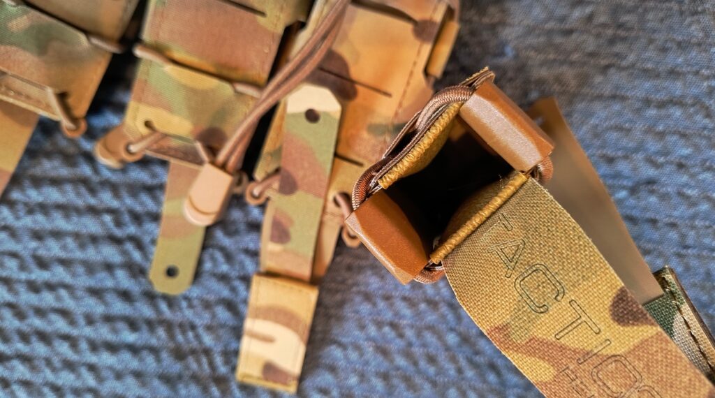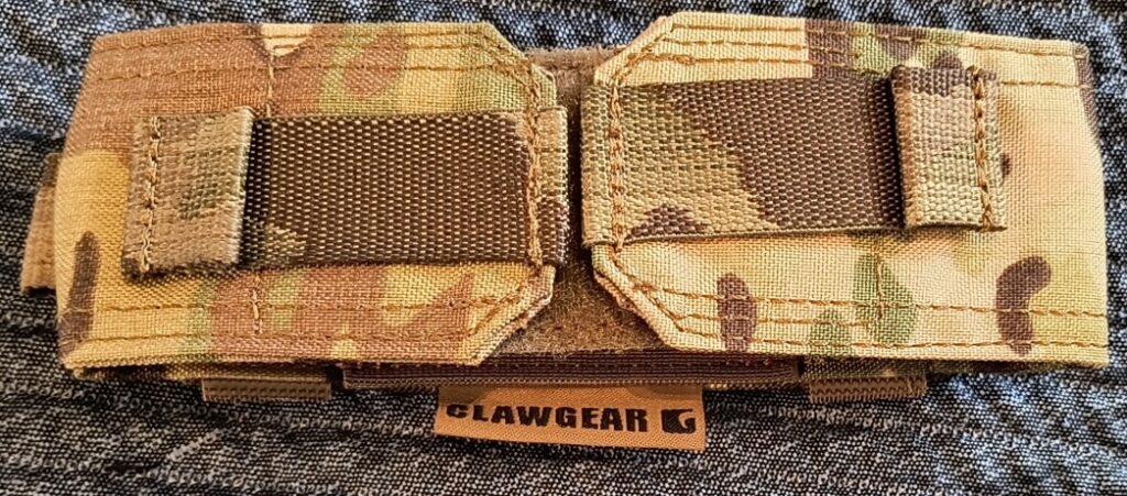 Pouch na stazę Claw Gear 2-Way Tourniquet Pouch. Bardzo ciekawe rozwiązanie, w postaci troka i pasków na rzep, umożliwiające zamocowanie go w orientacji pionowej i poziomej. Stazę można wsunąć z dołu lub od góry. Po bokach są elastyczne taśmy, które zapewniają stabilność stazy. Jednocześnie od góry i dołu mamy dwie klapki na rzep, więc stazę można wyjąć wygodnie z obu stron – sprawdzone na stazie CAT.