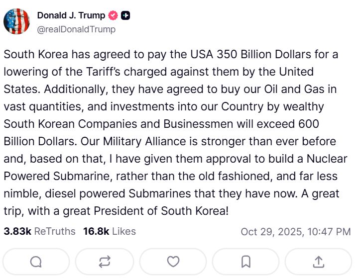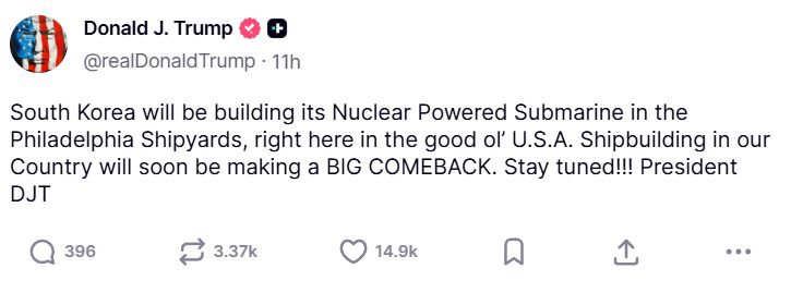 W swoim wpisie na platformie społecznościowej Truth Social Trump dodał, że sojusz koreańsko-amerykański jest silniejszy niż kiedykolwiek i w oparciu o to zezwolił Korei na budowę okrętów podwodnych o napędzie jądrowym zamiast przestarzałych dieslowskich jednostek, przy czym zaznaczył, że budowa przebiegałaby w amerykańskim zakładzie stoczniowym należącym do Hanwha w Filadelfii, czyli Hanwha Philly Shipyard.