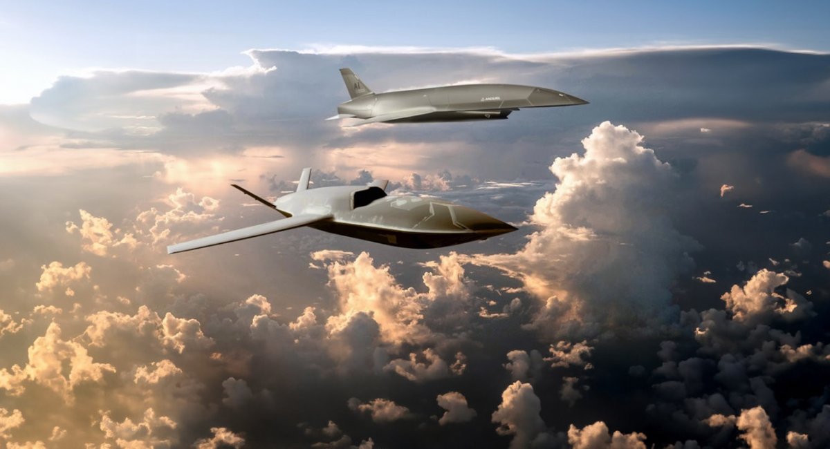 Prototypowe bezzałogowce Anduril YFQ-44A (na górze) i General Atomics YFQ-42A (na dole), wybrane w programie CCA Sił Powietrznych USA / Grafika: USAF