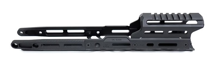 Model CRC 1CZ028 cechuje się nieco inną konstrukcją. Dzieli się na dwie części – „mostek” zakrywający lufę od góry cechuje się dodatkowymi otworami M-LOK na godzinie 3 i 9 oraz odcinkiem szyny Picatinny na godzinie 12. Dzięki zintegrowanej szynie, która – na oko – zrównana jest wysokością z szyną na komorze zamkowej, użytkownik uzyskuje wysunięty punkt mocowania wskaźnika laserowego.