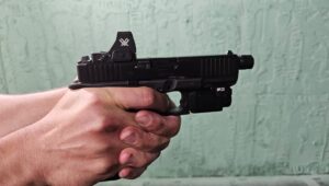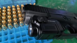 Kiedy założyłem latarkę pierwszy raz na mojego Glocka 17 III generacji… No dobra, na jego treningową atrapę z silikonu, to się zdziwiłem, jak mocno Nitecore trzyma się takiego materiału. Na początek pobawiłem się na sucho w domu wieczorem, potem wokół domu, żeby nie wystraszyć sąsiadki prawdziwym sprzętem. Jak pisałem wcześniej, te 900 lumenów z Nitecore NPL25 faktycznie bardzo dobrze się sprawdza i nie jest tego światła za dużo, jak się obawiałem.