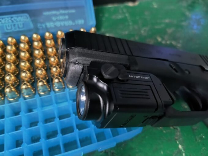 Najdłuższy wymiar Nitecore NPL25, 56 mm, sprawia, że nie wystaje ona poza szkielet pistoletu, a wręcz jest klika milimetrów od niego krótsza. Na zdjęciach Glock 45 (a więc i G19).
