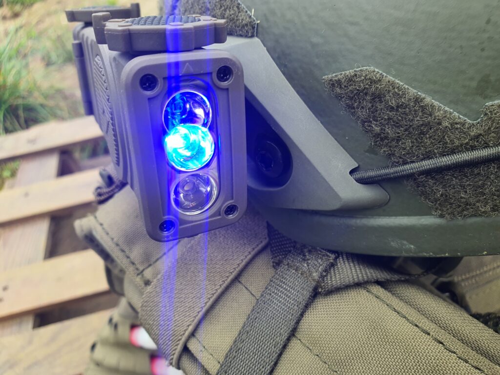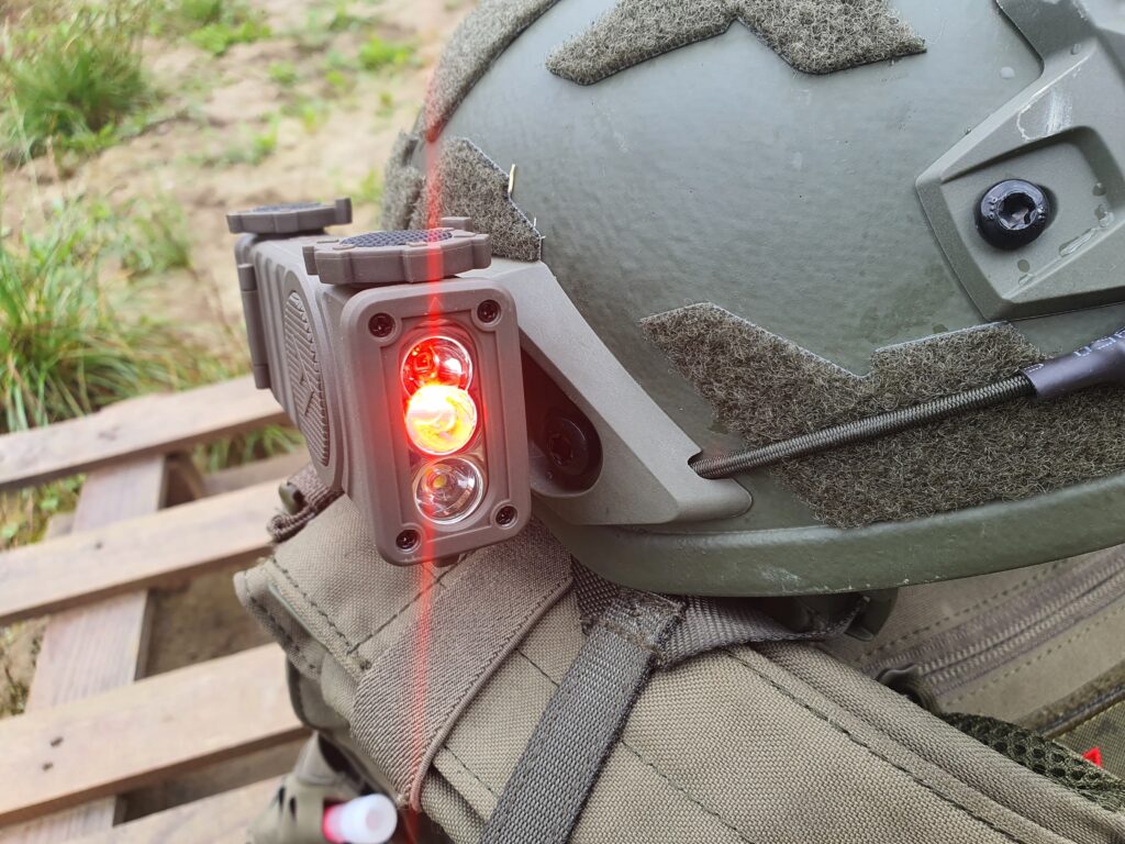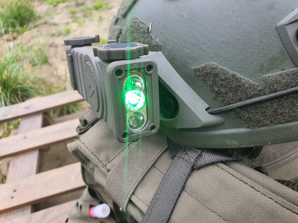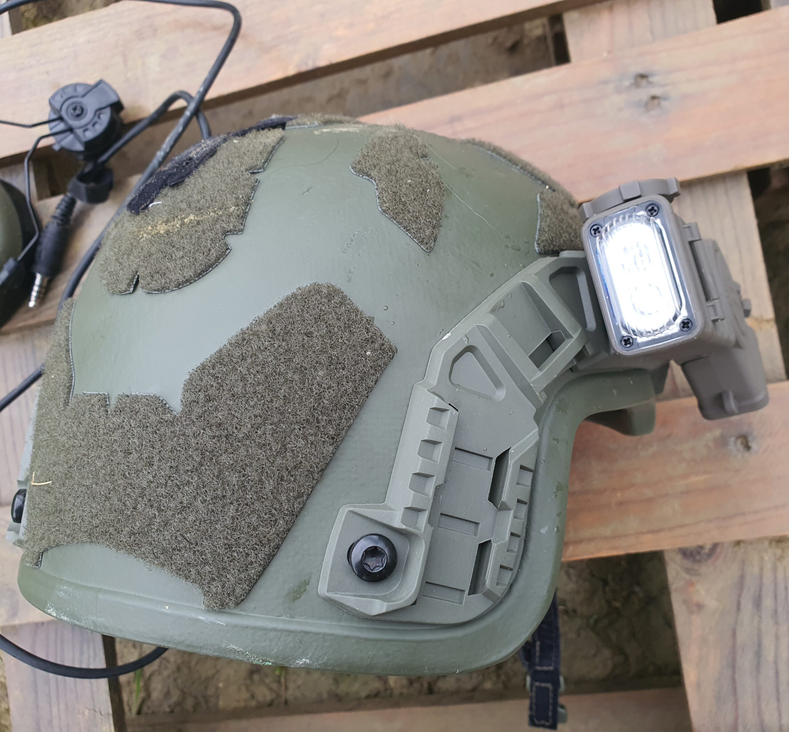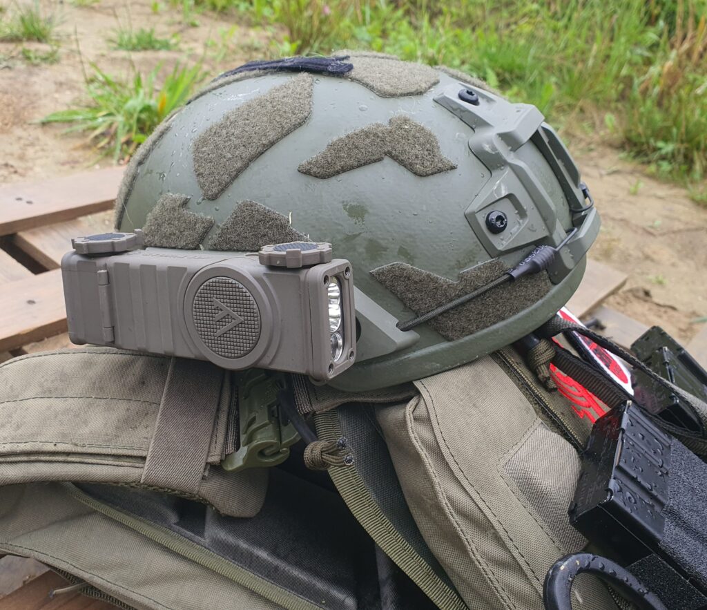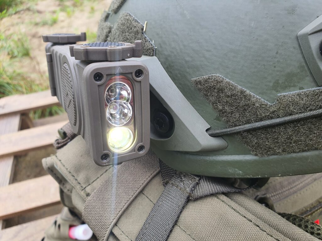 Przede wszystkim, żeby wygodnie z niej korzystać, należy zamontować ją na hełmie wyposażonym w szynę ARC i takie jest jej główne przeznaczenie. Jest naprawdę lekka i nie czuć dodatkowych 136 g. Jednocześnie jest przy tym naprawdę spora – ponad 13 cm zajmuje całą szynę hełmu balistycznego. Zarówno przód jak i tył mocno odstaje, przez co może być elementem, o który łatwo zawadzić. Prawda jest taka, że praktycznie wszystkie latarki dające mocne światło są dużych gabarytów i po przypięciu na hełm będą odstawać, więc… wybieramy albo coś minimalistycznego ze słabym światłem do podświetlenia rąk do pracy, albo uczymy się działać z porządną latarką.