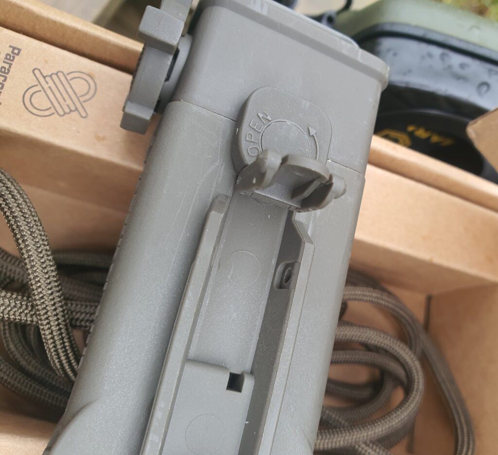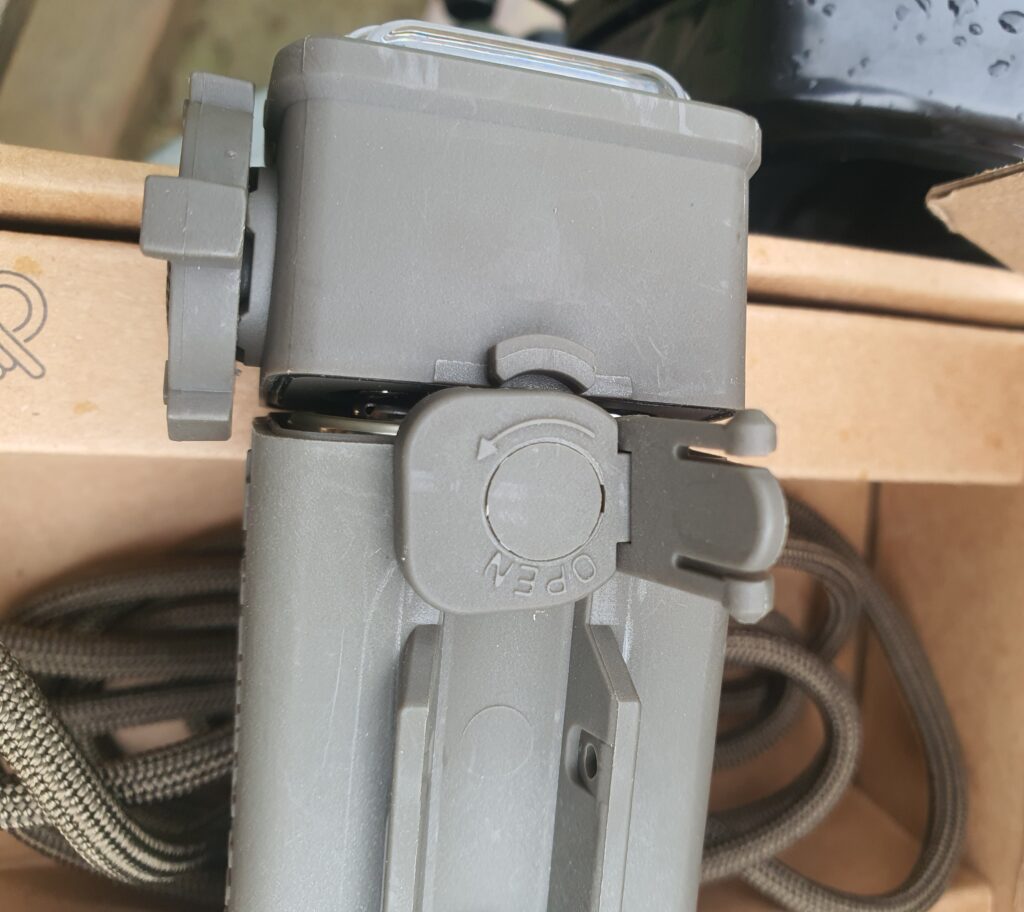 Żeby zamontować baterie, należy odhaczyć zabezpieczenie i obrócić zaczep. Zabezpieczenie trzyma dosyć mocno, ale łatwo można je podważyć palcem w rękawiczce. Tak naprawdę wymiana baterii jedną ręką nie sprawia żadnego problemu. Po założeniu latarki na szynę mechanizm jest zabezpieczony w szynie przed przypadkowym otwarciem.