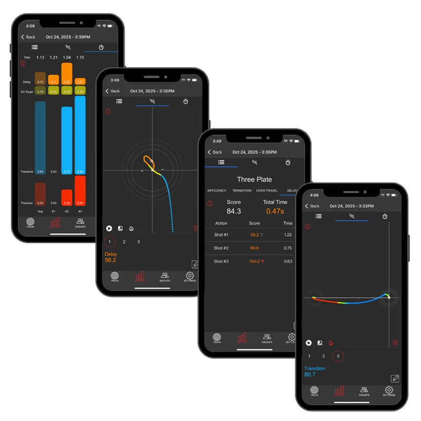 Standardowe ćwiczenia zapewniają informację zwrotną o kontroli spustu, wskazując najmniejsze błędy. Strzelec otrzymuje w aplikacji wynik, recenzję z uwagami oraz ponowne odtworzenie drogi przebytej przez punkt trafienia.