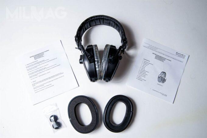 W zestawie załączono baterie więc ochronniki wydają się gotowe do pracy bezpośrednio po wyjęciu z pudełka. To złudne wrażenie, gdyż najpierw należy je wyregulować. Zakres tejże jest bardzo duży. Obejmuje nie tylko regulację góra-dół (oddalenie obudów od pałąka), ale przede wszystkim kąt z jakim obudowy przylegają do głowy. Jest to istotne z dwóch powodów. Pierwszym z nich jest komfort. Siła z jaką ochronniki są dociskane do głowy rozkłada się równo, nie powoduje więc uczucia punkowego nacisku. Drugi powód to szczelność wynikająca z równomiernego docisku na obwodach kopuł i co za tym idzie, lepsza ochrona słuchu. Niemniej konstrukcja MePaBlu Silencer Plus wymaga od użytkownika poświęcenia czasu na dostosowanie ochronników do kształtu i wymiaru głowy. Biorąc pod uwagę, że warto wprowadzić kolejne poprawki po kilku godzinach użytkowania, gdy już czuć jak leżą na głowie, ten czas na dostosowanie robi się odczuwalny. Natomiast po wyregulowaniu leżą jak przysłowiowa rękawiczka. Komfort jest bardzo wysoki. Nawet po wielu godzinach użytkowania nie czuć nacisku na skronie. Dotyczy to także noszenia okularów. Nie tylko strzeleckich o cienkich nausznikach, projektowanych z myślą o noszeniu wraz z ochronnikami słuchu, ale też zwykłych korekcyjnych. Szczególnie błyszczą tutaj nakładki żelowe. Dodają całkiem nowy poziom komfortu, niespotykany w ochronnikach bez tego akcesorium.