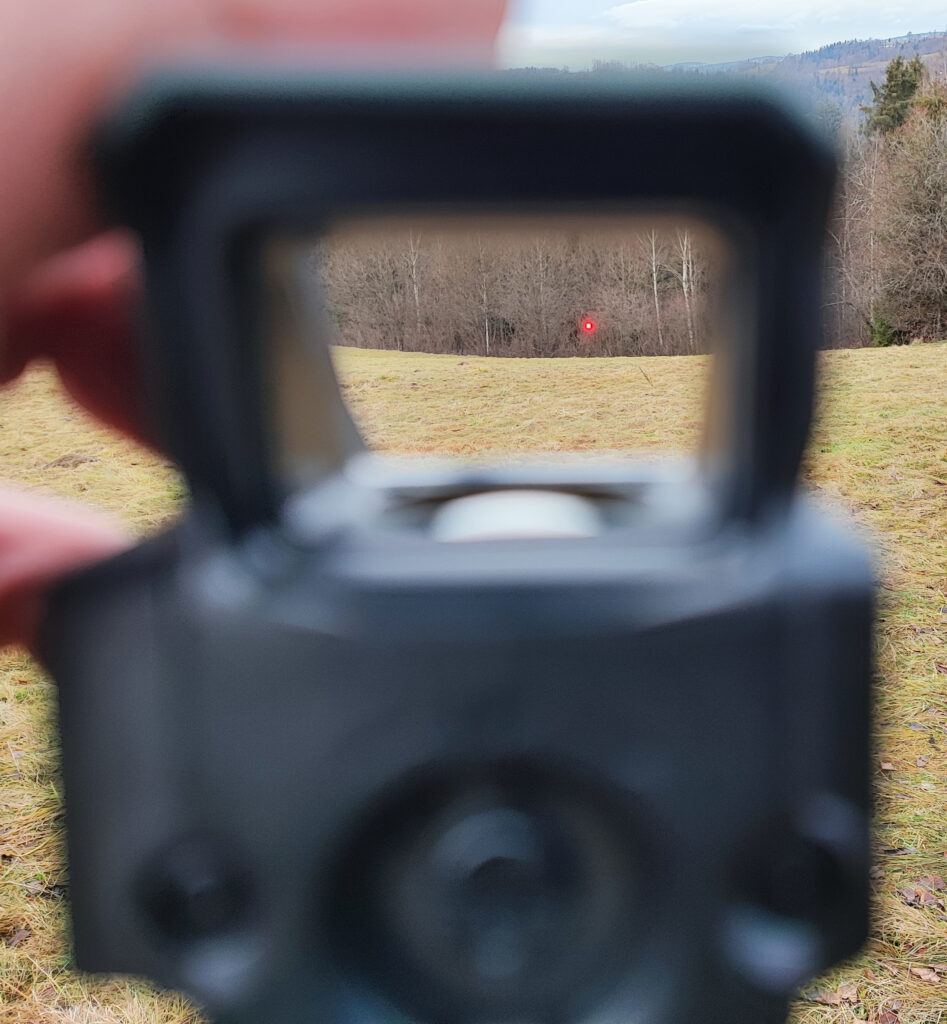 Punkt celowniczy: na prawym zdjęciu obraz jaki widzi strzelec, na lewym widoczna dokładnie kropka wielkości 2MOA. Widać, że jest regularna zarówno kształtem jak i kolorem. Mój astygmatyzm jednakże ukazuje ją jako nieco rozchwianą gwiazdę. Powinno to dać do myślenia osobom, którym zdaje się, że kupili kiepski celownik: może problemem jest problem ze wzrokiem a nie jakość sprzętu