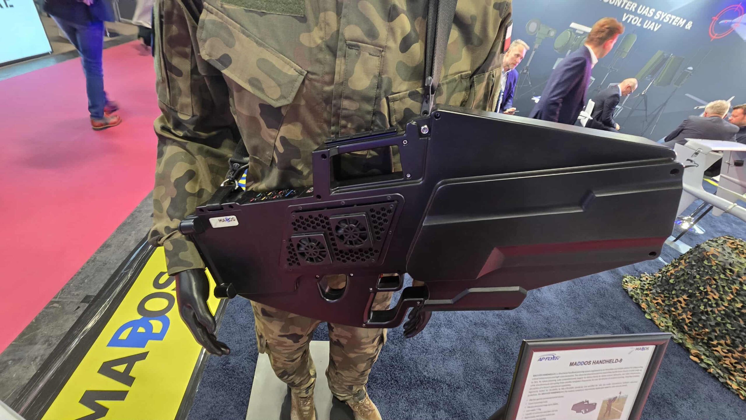 Kolejnym prezentowanym rozwiązaniem był system niekinetycznego obezwładniania bezzałogowców o nazwie MADDOS HandHeld-9. Jest to ręczny zestaw antydronowy zdolny do neutralizacji niewielkich bezzałogowców, głównie komercyjnych, takich jak DJI, na dystansie do 2 km od operatora na ziemi.