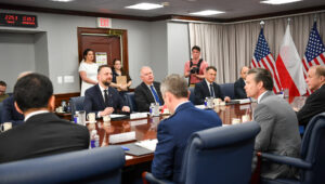 Kolejna sprawa to inwestycje w infrastrukturę na terenie Polski. Planujemy do 2035 roku wydawać 250 milionów dolarów rocznie na inwestycje wspólne, infrastrukturalne – polsko-amerykańskie. Ostatnio taką bazę oddaliśmy w Drawsku. Polska przeznacza 15 tysięcy dolarów rocznie na jednego amerykańskiego żołnierza. To piękny wkład w naszą wspólną obronę i na tym tle wyróżniamy się spośród innych państw europejskich. 128 kontraktów na sumę przekraczającą 60 miliardów dolarów – to również gwarancja polskiego bezpieczeństwa. Chciałbym podziękować całemu zespołowi – na czele z panem ministrem Zalewskim, naszym ambasadorem w Stanach Zjednoczonych, naszym attaché wojskowym w Waszyngtonie – za perfekcyjne przygotowanie tego spotkania. To pokazuje, jak Polska jest silna – dodał wicepremier.