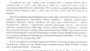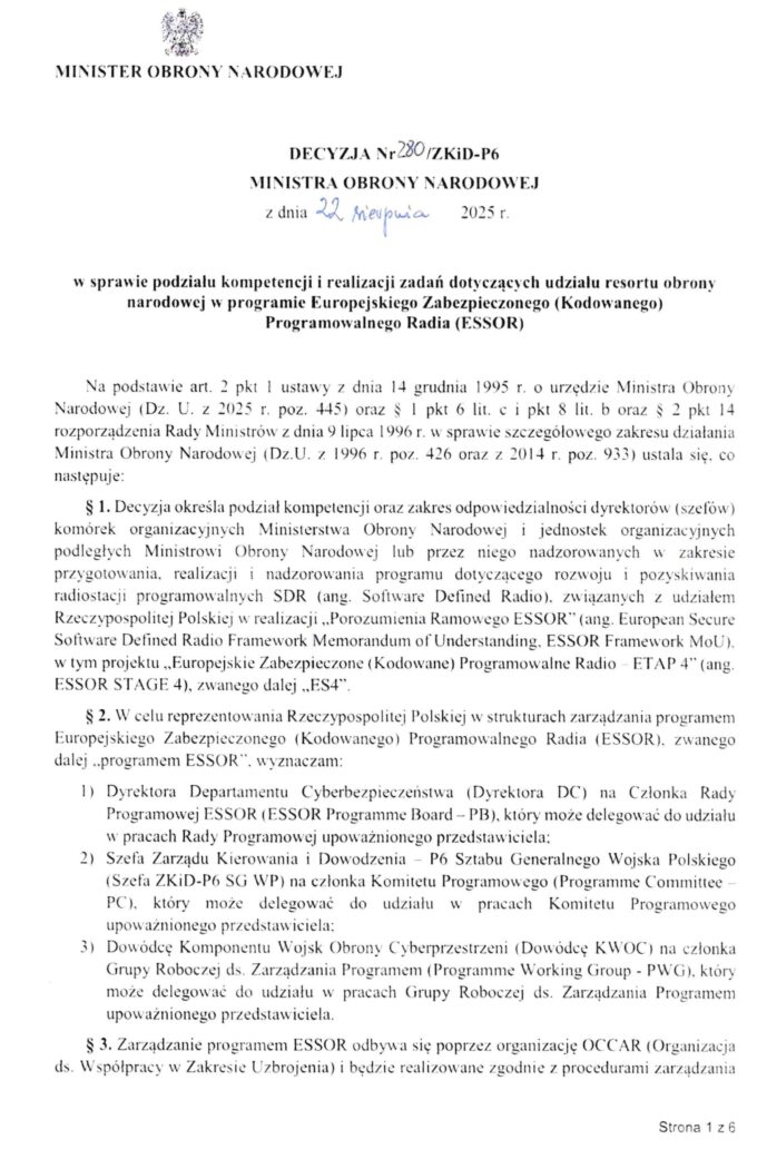 Z uwagi na duże zainteresowanie tematem oraz pojawiające się nieprawdziwe informacje o rezygnacji resortu obrony narodowej z udziału w programie ESSOR w latach 2025-2028, Ministerstwo Obrony Narodowej udostępniło skan Decyzji (wersja PDF do pobrania):