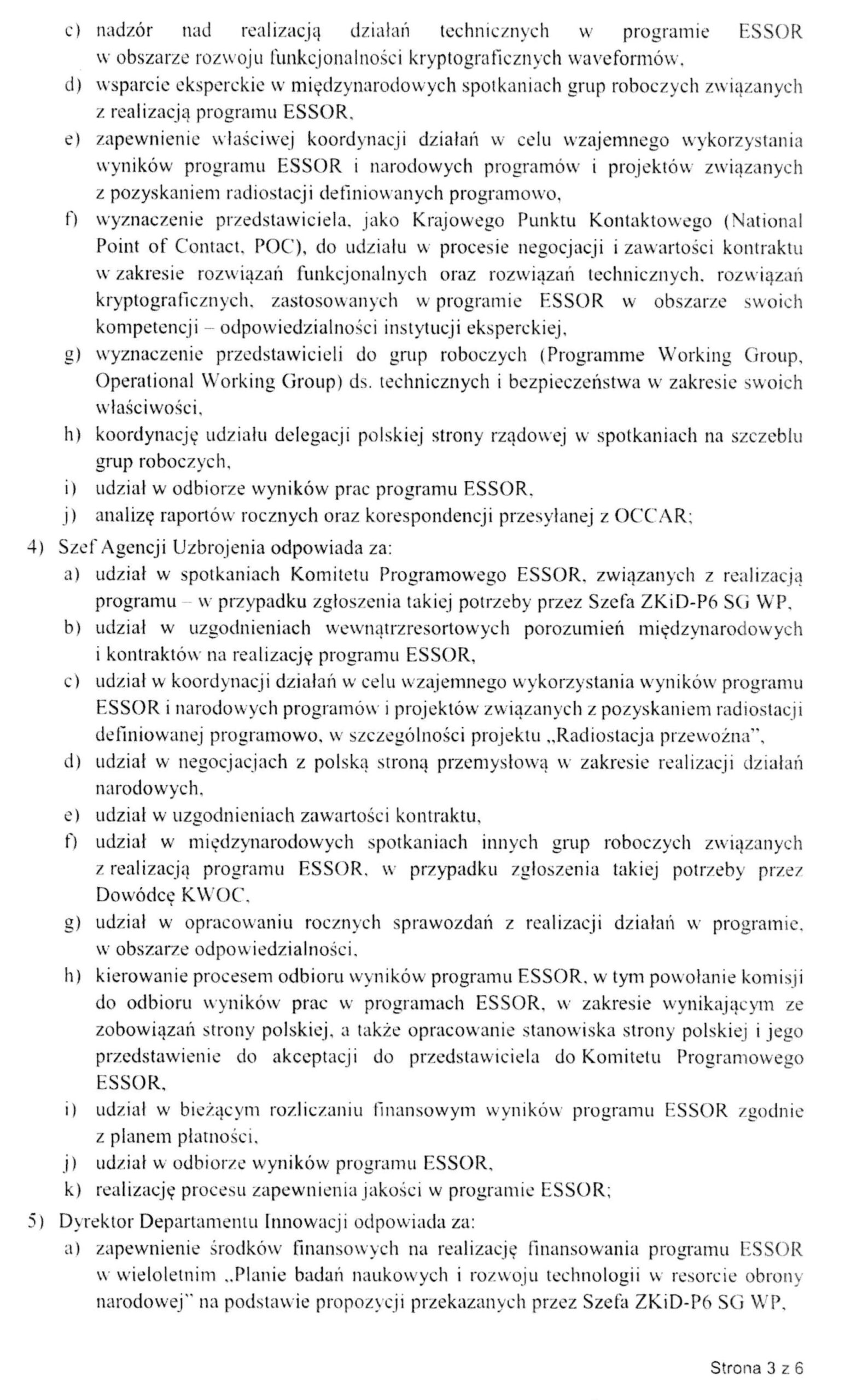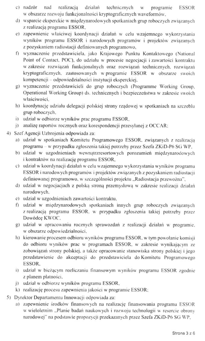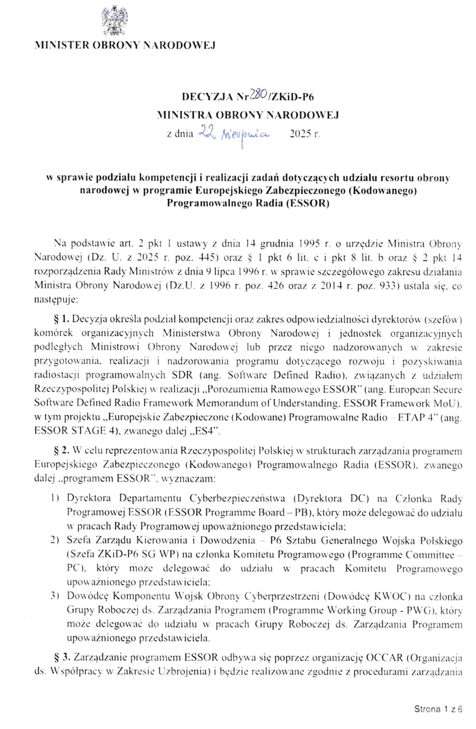 9 października 2025. W związku z przyjęciem przez Radę Modernizacji Technicznej rekomendacji dotyczącej kontynuacji prac i dalszego udziału Rzeczpospolitej Polskiej w kolejnym etapie programu ESSOR w latach 2025-2028 oraz zmianą ról w zarządzaniu tym programem, celem zapewnienia koordynacji działań oraz ustalenia odpowiedzialności osób funkcyjnych w resorcie obrony narodowej, konieczne było wydanie nowej decyzji w sprawie podziału kompetencji i realizacji zadań dotyczących udziału resortu obrony narodowej w programie Europejskiego Zabezpieczonego (Kodowanego) Programowalnego Radia (ESSOR).
