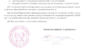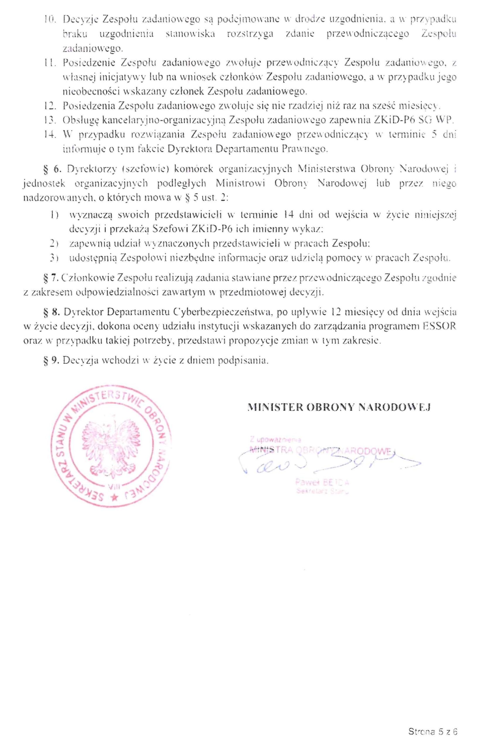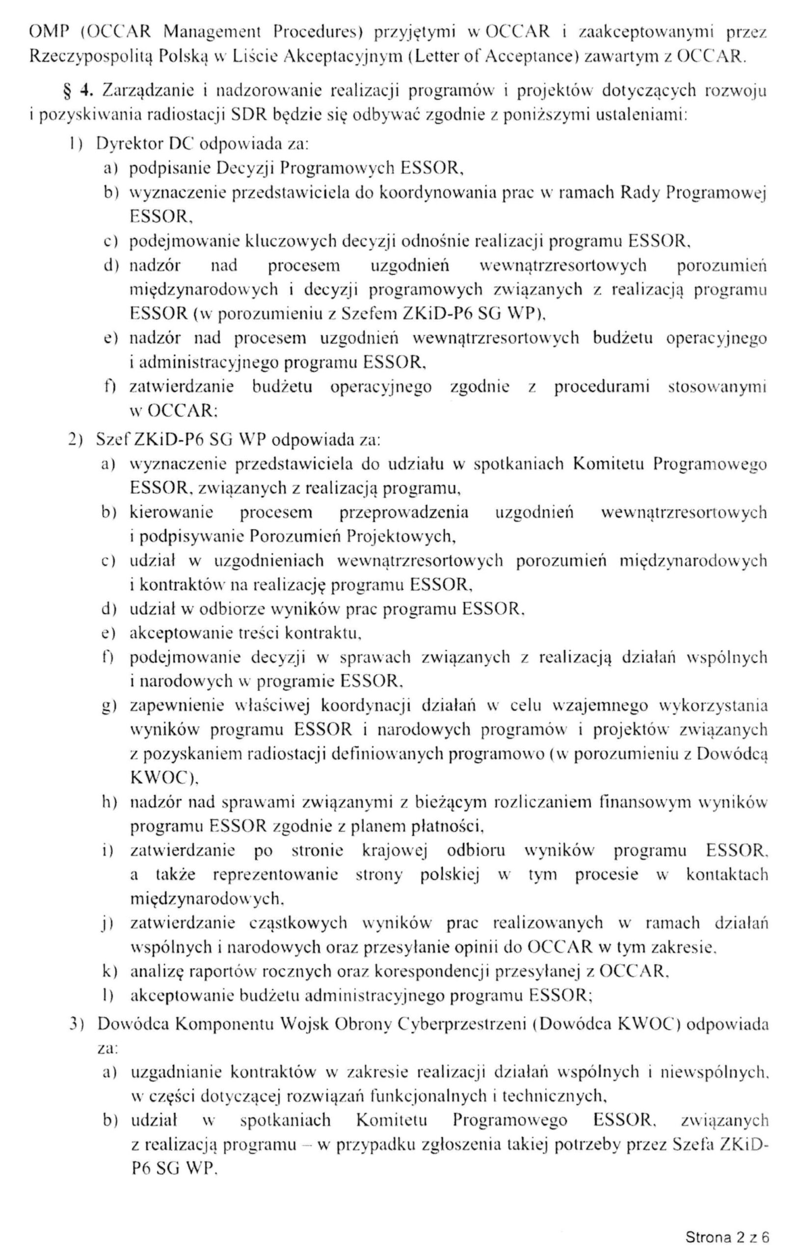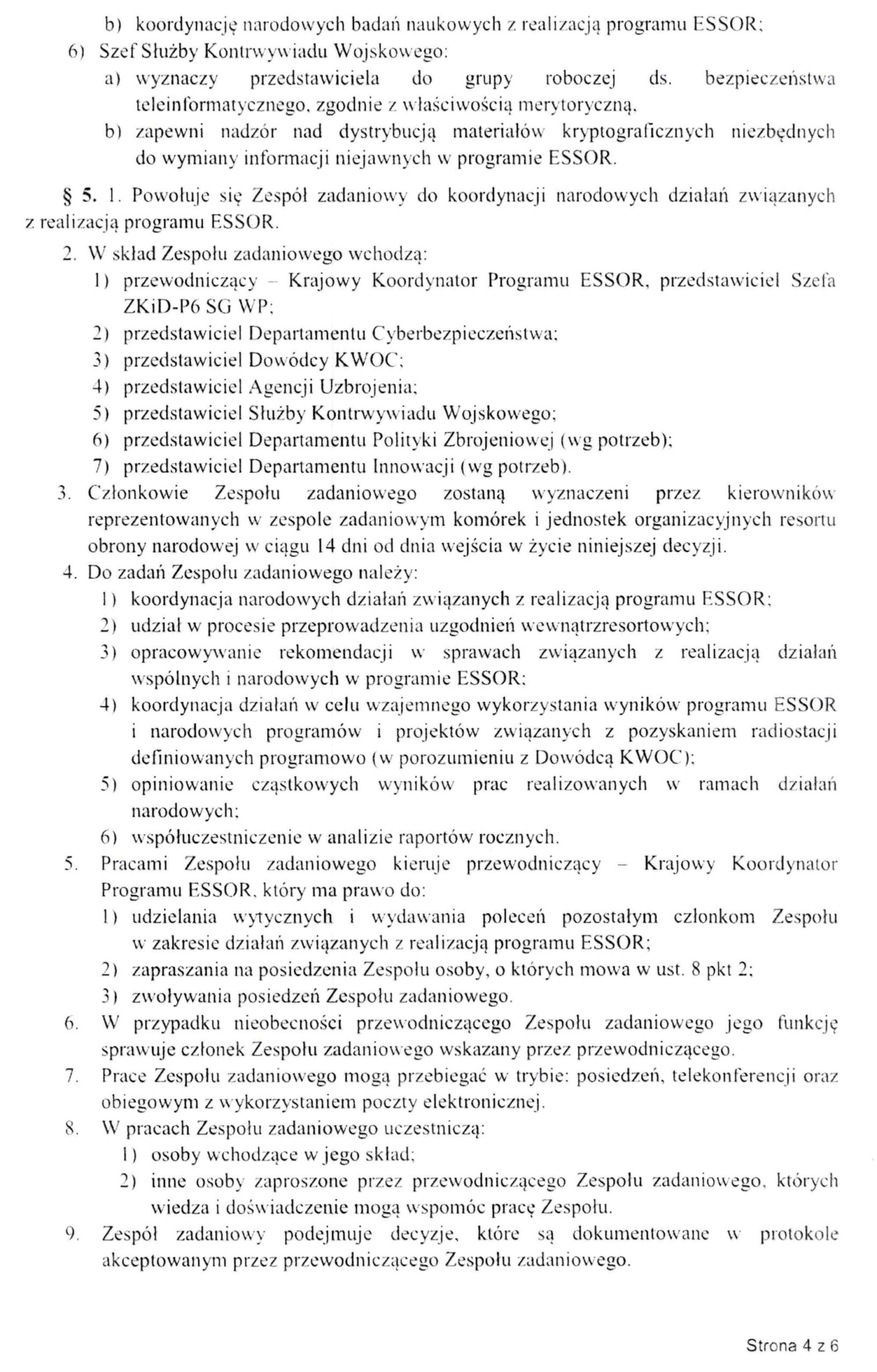 9 października 2025. W związku z przyjęciem przez Radę Modernizacji Technicznej rekomendacji dotyczącej kontynuacji prac i dalszego udziału Rzeczpospolitej Polskiej w kolejnym etapie programu ESSOR w latach 2025-2028 oraz zmianą ról w zarządzaniu tym programem, celem zapewnienia koordynacji działań oraz ustalenia odpowiedzialności osób funkcyjnych w resorcie obrony narodowej, konieczne było wydanie nowej decyzji w sprawie podziału kompetencji i realizacji zadań dotyczących udziału resortu obrony narodowej w programie Europejskiego Zabezpieczonego (Kodowanego) Programowalnego Radia (ESSOR).
