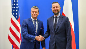 Przed chwilą miałem bardzo ważne spotkanie i o tym chciałbym powiedzieć pewnie najwięcej. Chwilę temu zakończyłem spotkanie z sekretarzem obrony Pete’em Hegsethem. To jest trzecie moje spotkanie w ciągu jego kadencji, która rozpoczęła się w styczniu tego roku. Chyba spośród ministrów państw NATO nikt nie miał tylu możliwości do rozmowy. Potwierdziliśmy sojusznicze zobowiązania pomiędzy Stanami Zjednoczonymi a Polską. Jeszcze raz chciałem przekazać podziękowania dla wszystkich naszych rodaków za ten wkład w obronność, za prawie 5% wydatków na zbrojenia, za bycie liderem, jak powiedział do mnie Pete Hegseth, obronności, liderem sojuszu w Europie za nasze działania. Potwierdziliśmy relacje na najwyższym poziomie i też rozmieszczenie amerykańskich żołnierzy w Polsce, podnoszenie zdolności. Jesteśmy po wspólnych ćwiczeniach Żelazny Obrońca, w których udział brał ambasador Stanów Zjednoczonych przy NATO. Przekazałem też sekretarzowi obrony te informacje, doświadczenia z przebiegu tych wspólnych ćwiczeń. (…) Potwierdzona jest też stabilna obecność żołnierzy amerykańskich w Polsce – zaznaczył szef MON.