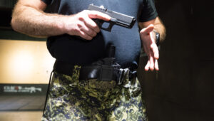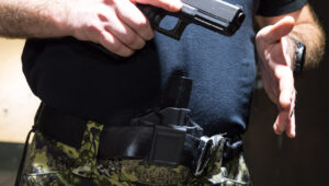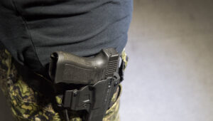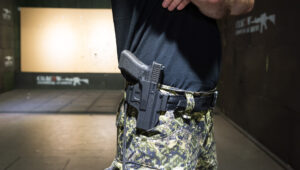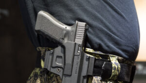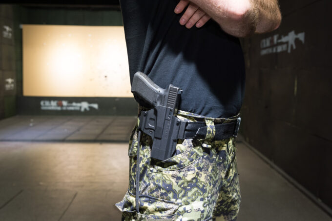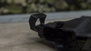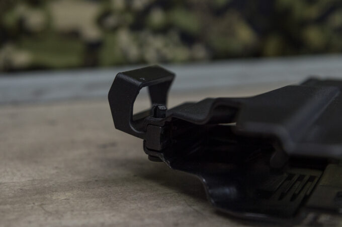 Nadeszła pora na samą śmietankę tego artykułu, czyli noszenie. I tutaj będą pozytywy. Kabura, mimo że nie posiada żadnego aktywnego zabezpieczenia, spełnia swoją rolę bardzo dobrze. W fabrycznym ustawieniu klika wyraźnie, a dobycie wymaga lekkiego szarpnięcia. W sam raz na tyle, by bez obaw o wypadnięcie broni nosić ją na co dzień. Warto jednak wspomnieć, że producent przewidział możliwość regulacji siły docisku na broni. Odbywa się ona przez przekręcenie śruby umieszczonej pod kabłąkiem. Na jej osi osadzono gumowy pierścień pełniący funkcję amortyzatora. Dzięki temu zabiegowi użytkownik może dopasować według swoich preferencji siłę potrzebną do dobycia. Warto pamiętać, że w przypadku IWB pasek powoduje dodatkowy nacisk na ścianki kabury, przez co dobycie wymaga większej siły. Tak czy inaczej broń sama nie wypada i zatrzaskuje się z wyraźnym kliknięciem. Co więcej, odpowiedni kształt wycięcia kabury pozwala nosić Glocka nawet z miniaturowym celownikiem kolimatorowym.